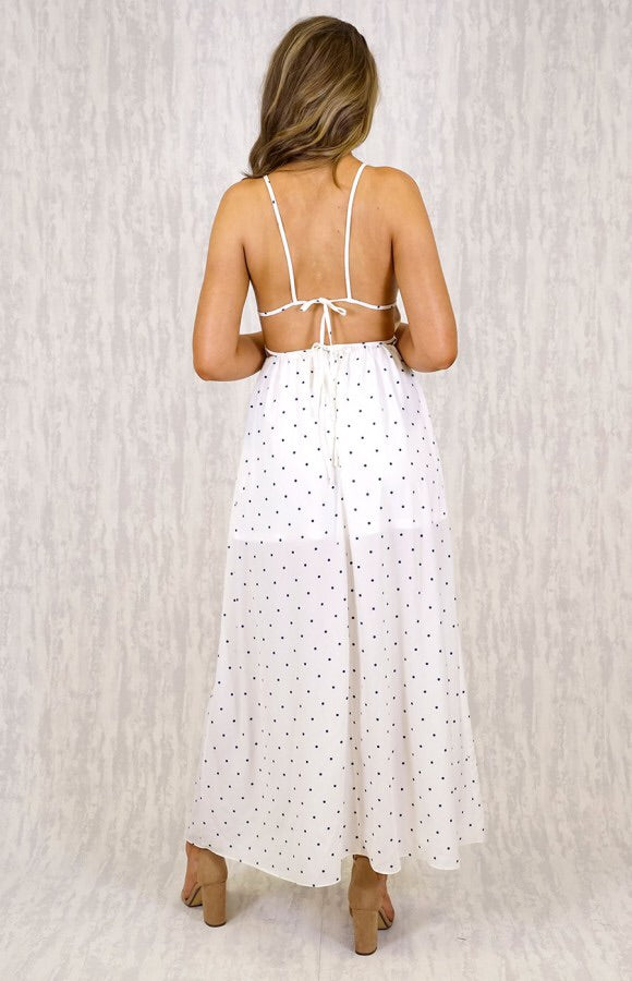 Gorgeous flowing white maxi dress with spotted detail. Open back that ties. Split side.