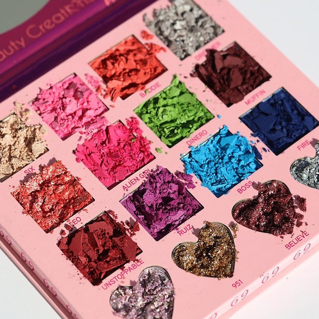 The Annette69 Eyeshadow Palette contains a mix of mattes, shimmers, and glitter toppers. The 9 mattes are meant to take you out of our comfort zone and allows you to create bold and colorful looks all year long. The 3 shimmers are perfect for your inner corner or take them directly to your lid. The 4 glitter toppers are for our bold babes who aren't afraid of a lot of sparkle, guaranteed to stand out.