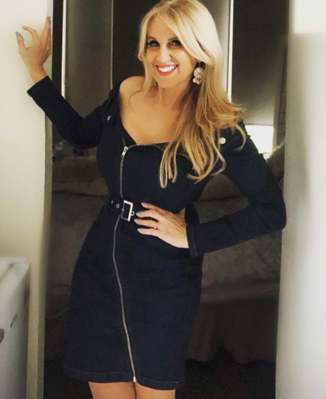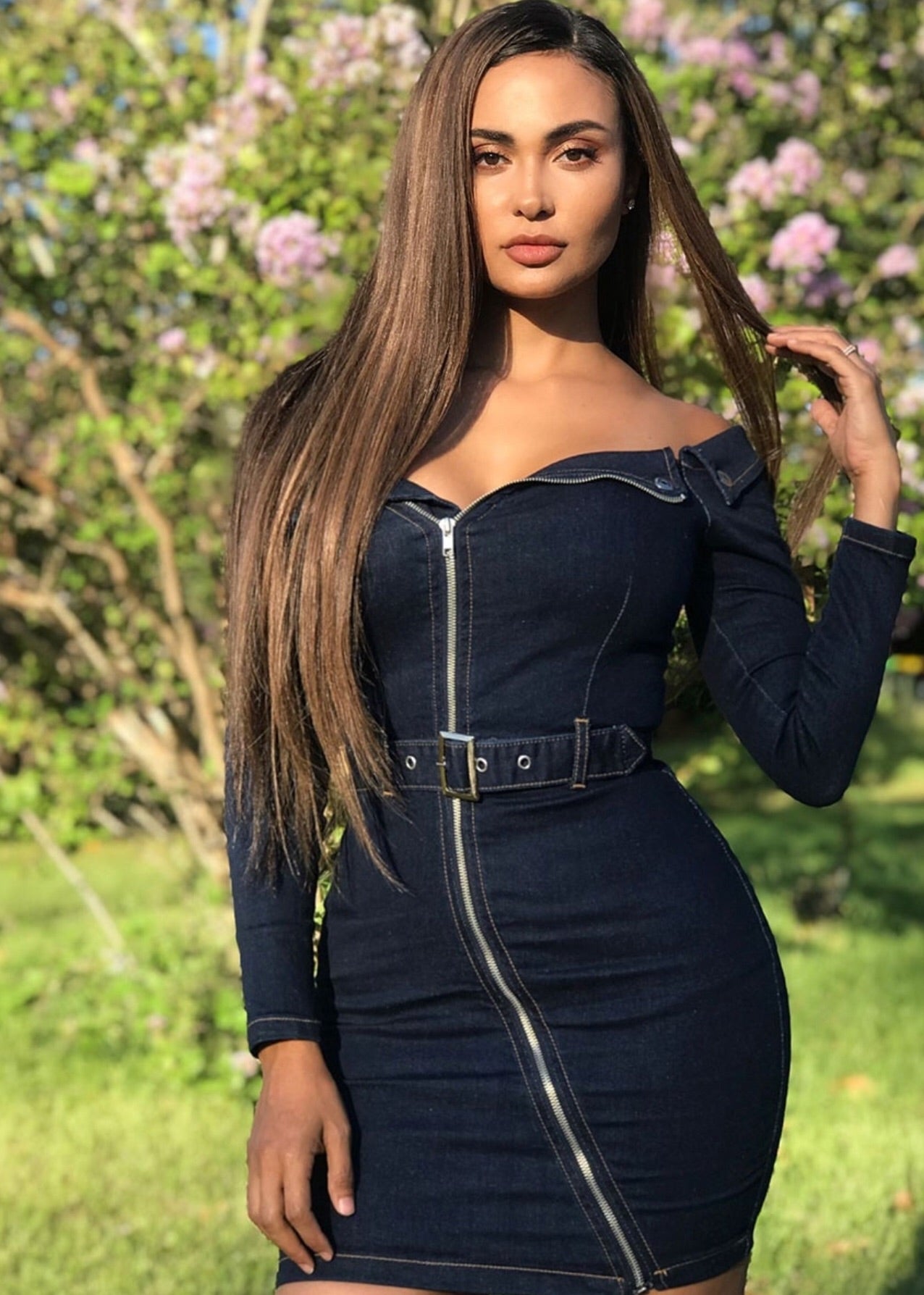 Discover the ultimate denim dress we are loving this season! This bodycon mini dress featuring bardot off the shoulder & zip front teamed with heels will give you a show stopping look for a night out!
