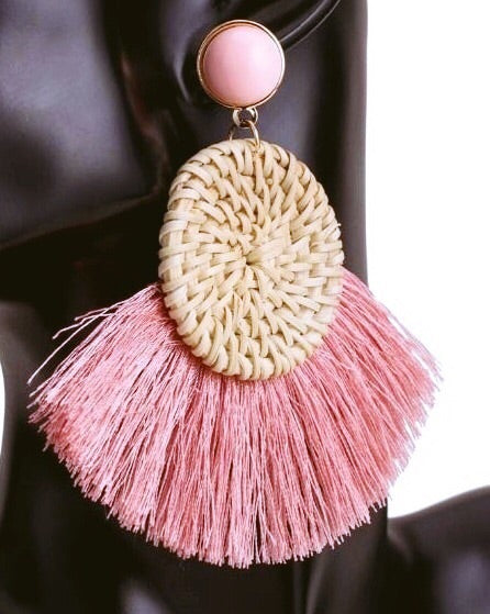 Gorgeous pink blush tassel earrings. Woven design. Statement earrings