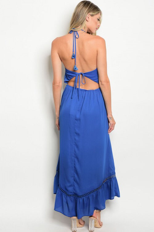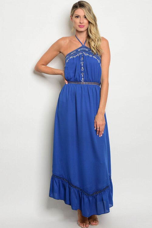Blue backless trip up maxi dress. Embroidery detail at front. Tie neck