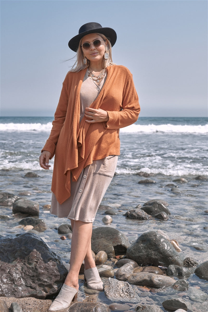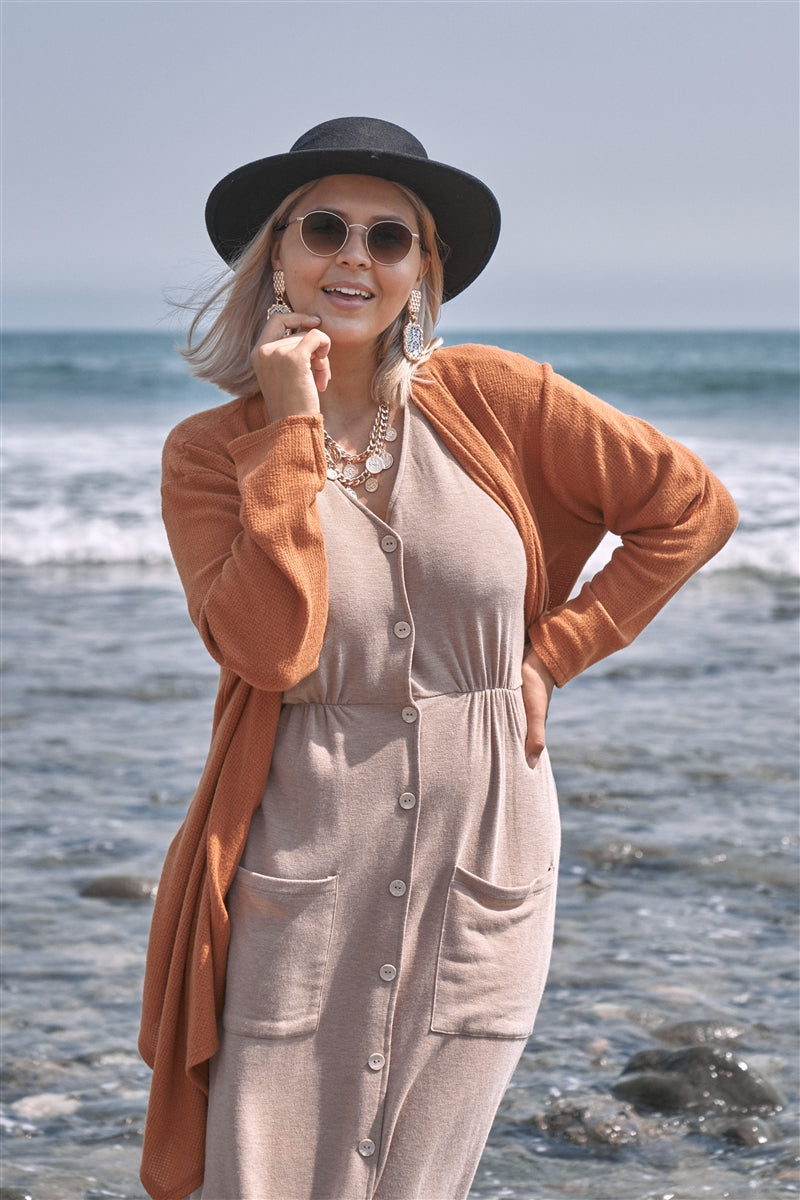 This dress is exclusive to our Curvy plus range with its Mocha, solid, fleece, short sleeve, elastic waist, v-neck, backside waist tie, two front pockets, unlined, button up, comfy, casual