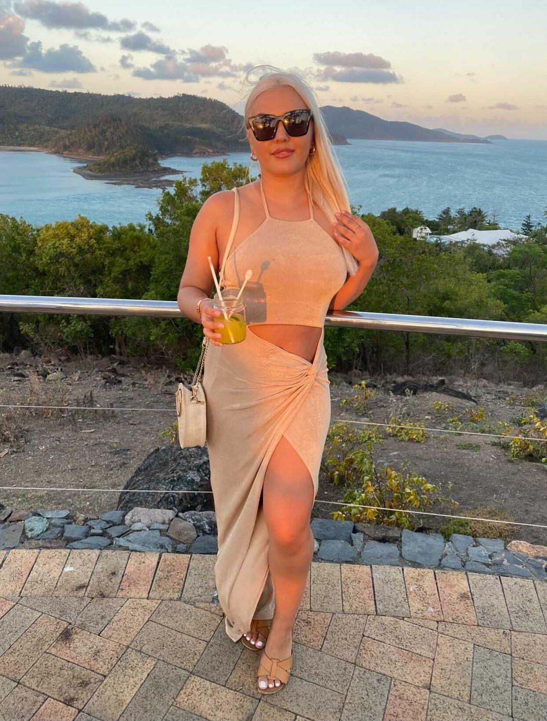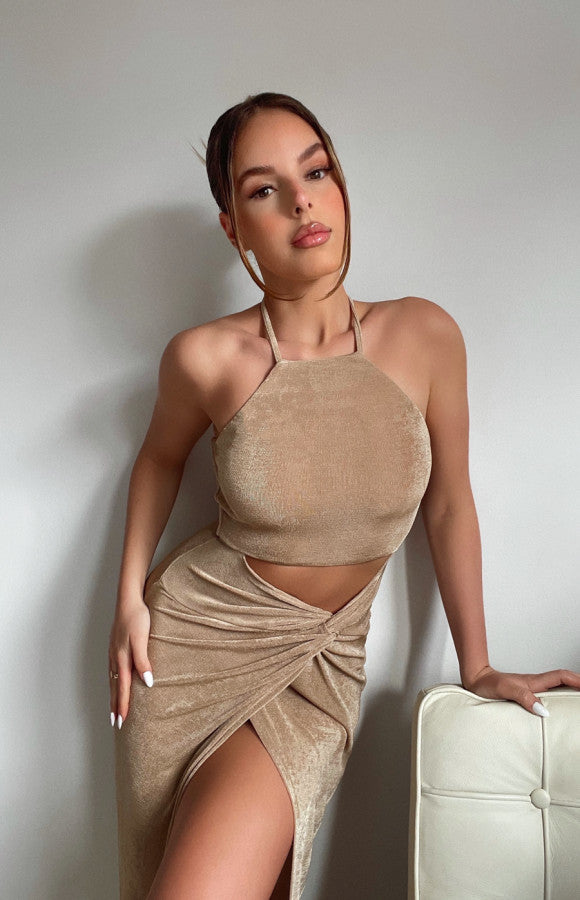 This dress is absolutely gorgeous with its golden colour and featuring Slinky jersey fabrication.Halter neck design