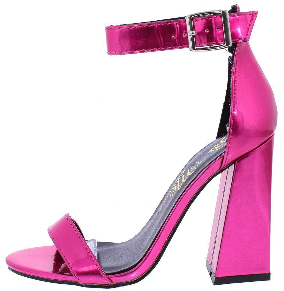 Chunky open toes bright pink heels. Statement