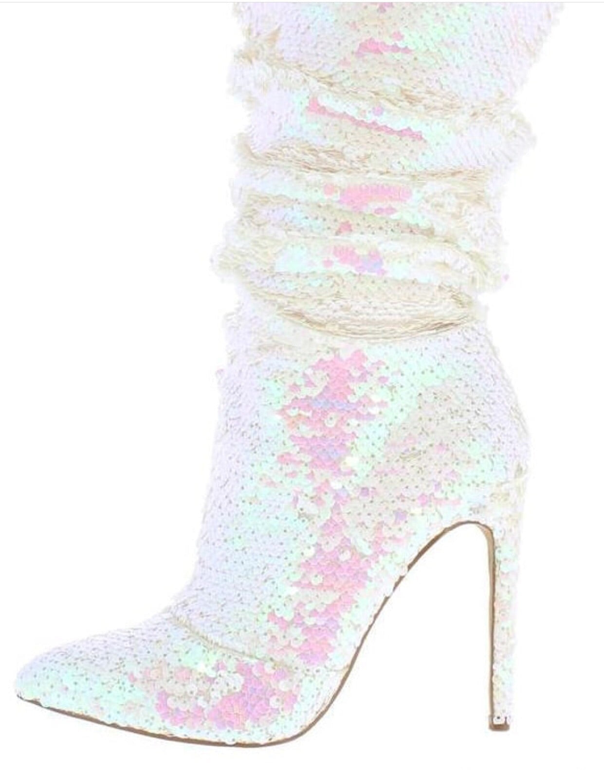 White sequence heeled boots. Slouch style white pink and coloured light erridecent sequences. Statement heels