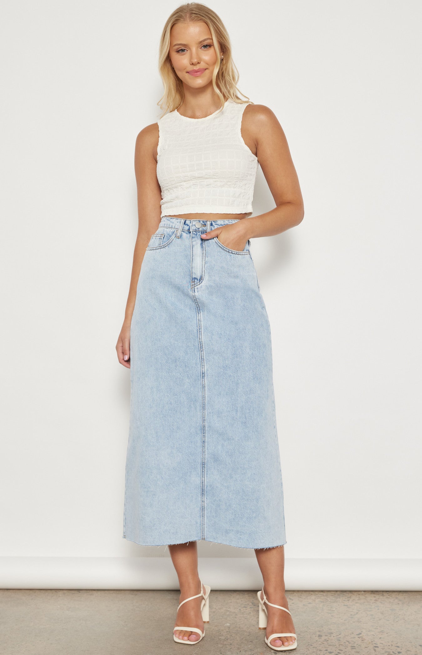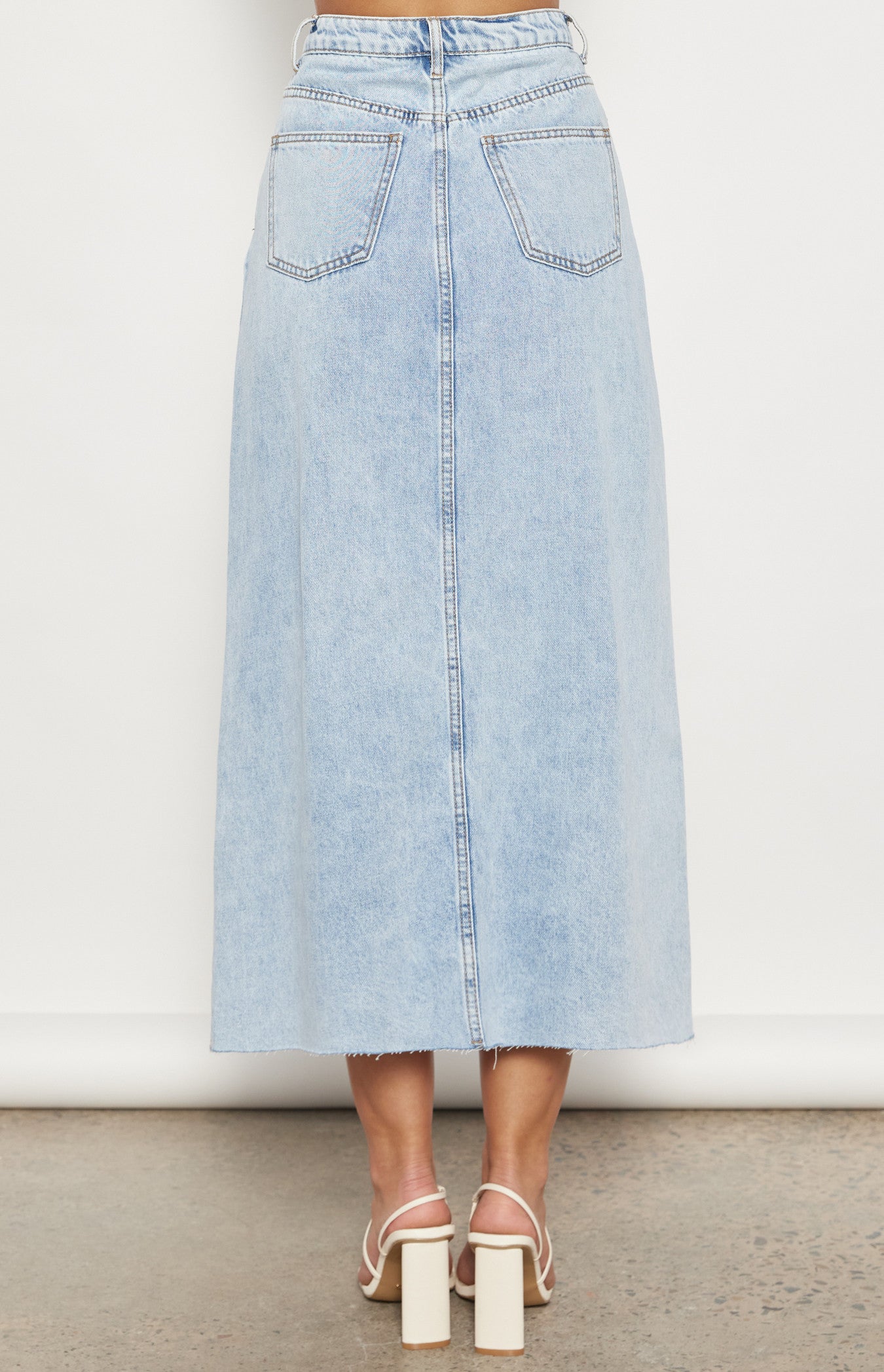 This denim maxi is so versatile with its Cotton denim fabrication. High waisted. Fabric belt loops. Functional pockets. Fly front with exposed button. A-line design Raw edge detail. Maxi length. Wear day to night you will lovr this skirt