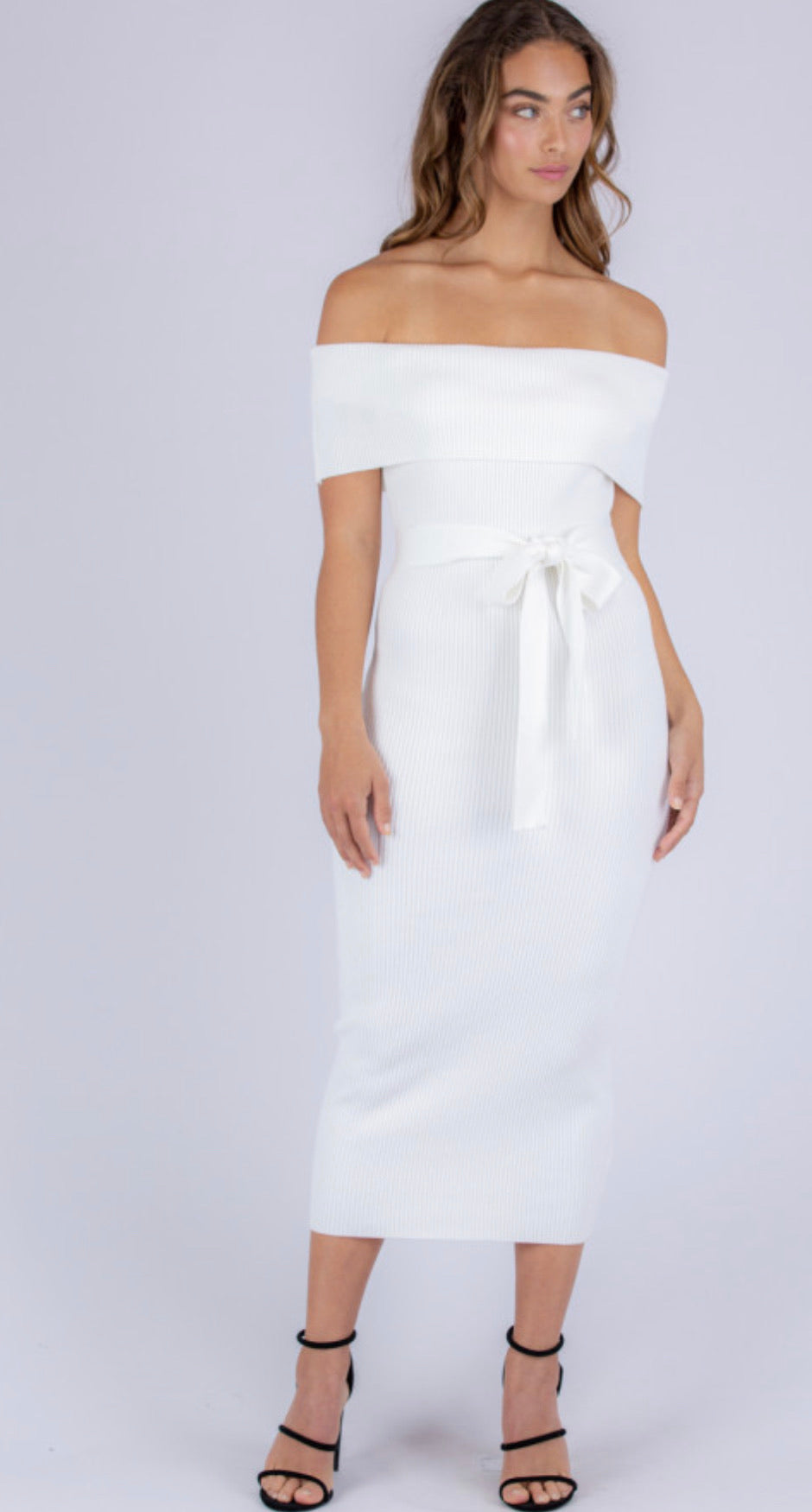 This dress is so beautiful with its , Rib knit fabrication Off the shoulder style fitted design. Self fabric belt. Midi length it’s sure to make you feel like your in cloud 9. Full stretch. Great for maternity wear tooÂ