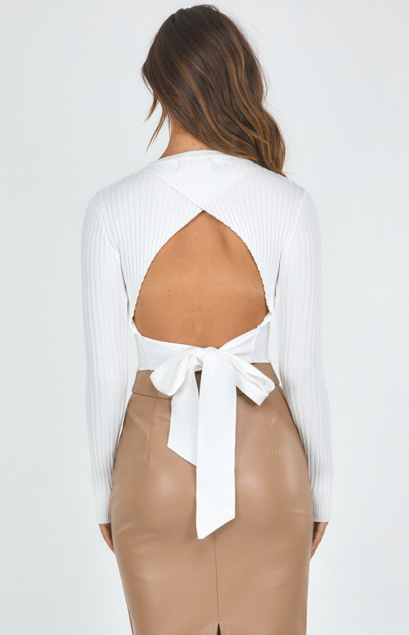 This knit top is gorgeous with its Round necklineMedium weight ribbed knit. Long sleeve design. Open back with tie design.Cropped length.Fitted design. Model is 173cm tall and is wearing a size S/M