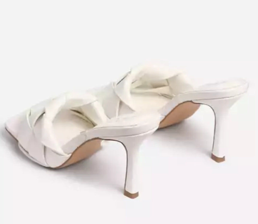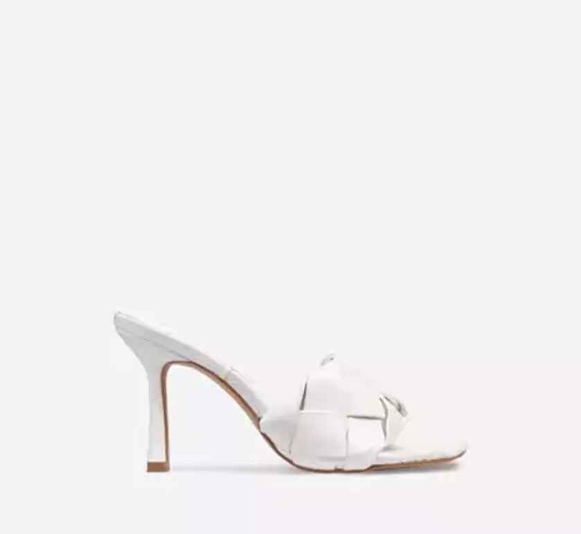 These mules feature a square toe, woven upper, low stiletto heel and white faux leather finish. A must have this season