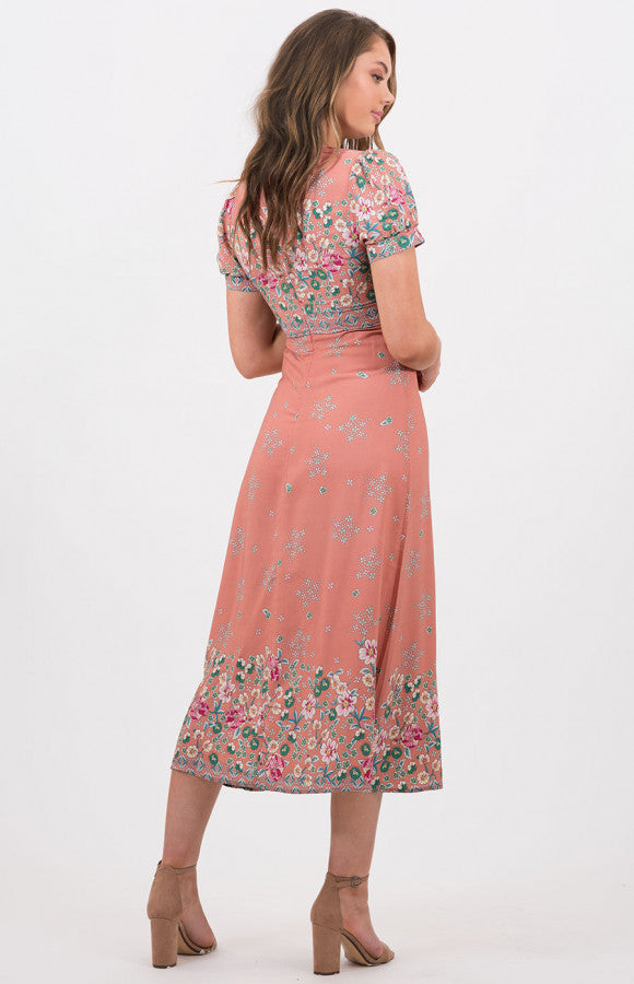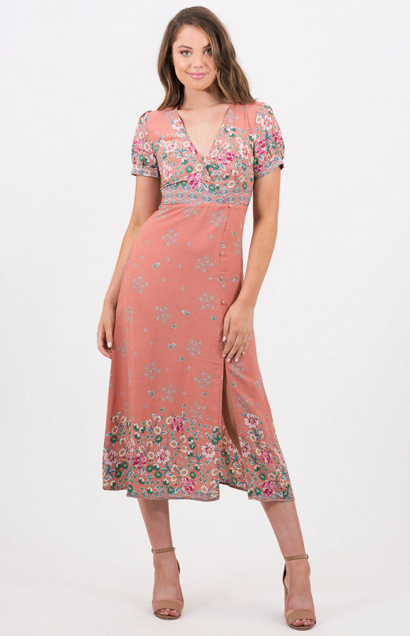 Pink rust coloured floral dress. Short sleeved. Button front. Midi flow dress