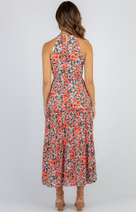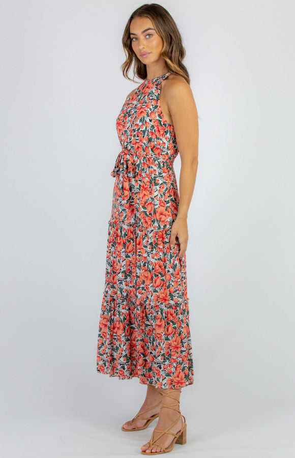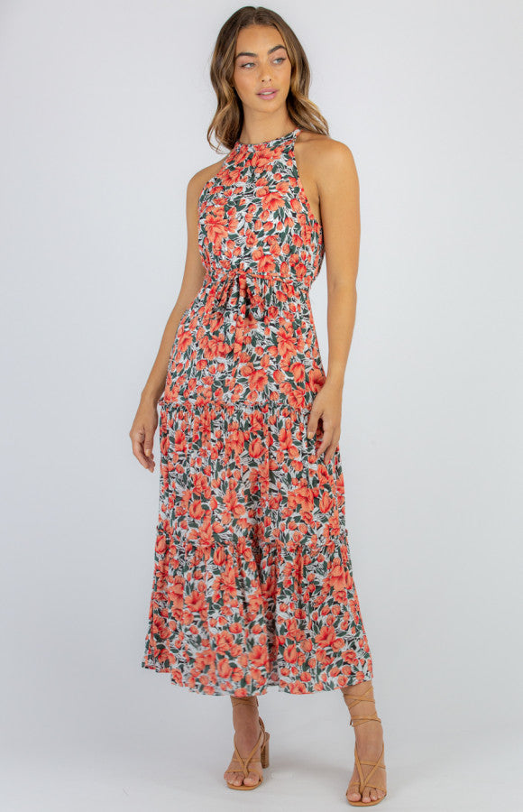 This maxi dress is great for this season with its . Bright Floral print fabrication. Halter neck style. Back button with key hole. Self fabric belt with string loops. Elastic detail at waist. Tiered maxi dress design . Model is 173cm tall and is wearing a size 6.