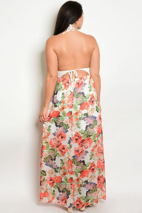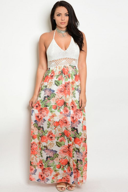 Tie up maxi with a floral printed skirt. Halter neck with lace detailing at midriff.