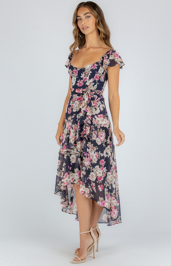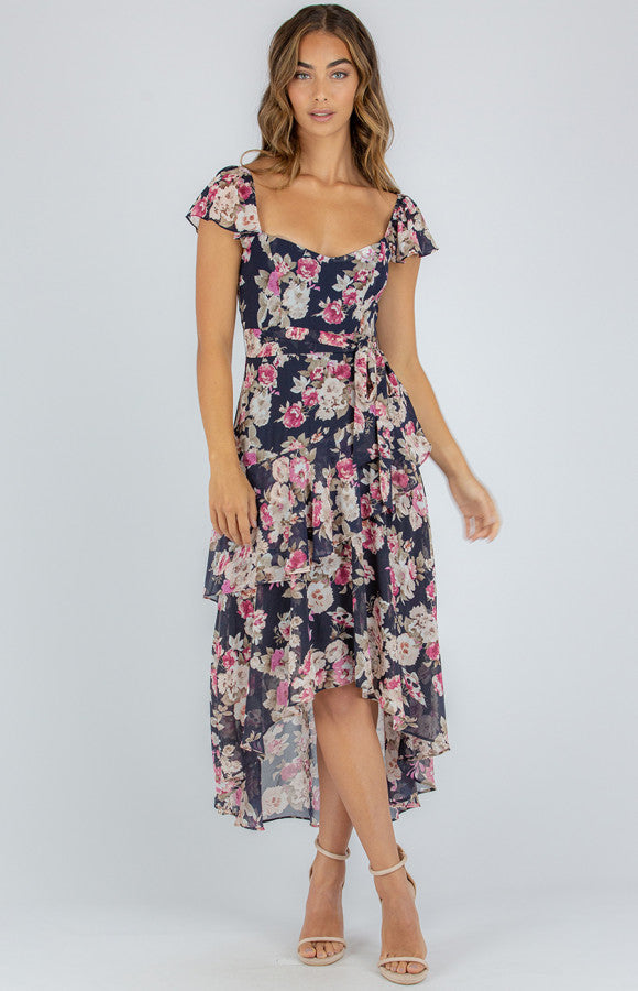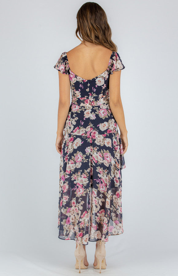 This dress us so dreamy with its Love heart neckline-Floral print design-Elastic around shoulder detail-Frill cap sleeve-Removable tie around waist-Invisible zip centre back-Frill details along hem-Waterfall style dress-Fully lined-Maci lengt- Our model is 173cm tall and is wearing a size 6.