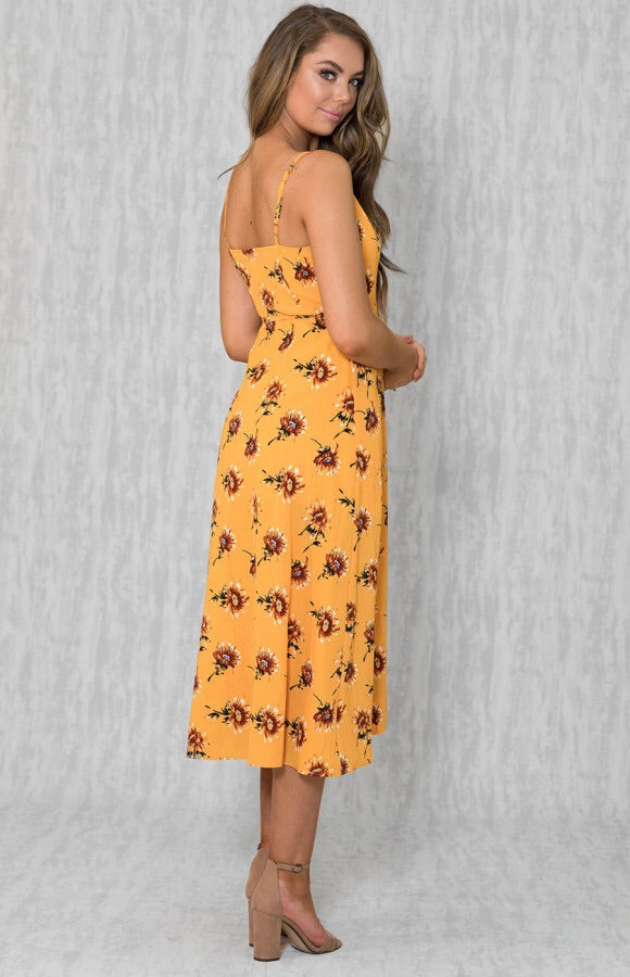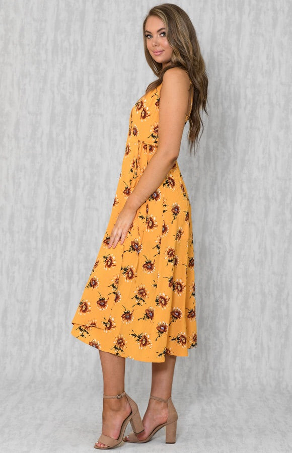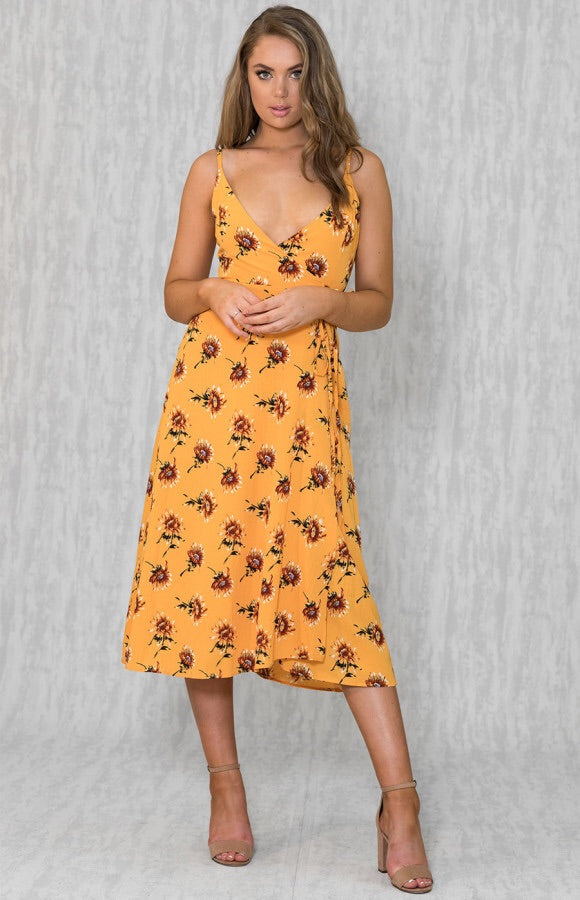 This dress is full of colour with its midi design, wrap dress, tie waist. Sunflower colours. Perfect for this season.