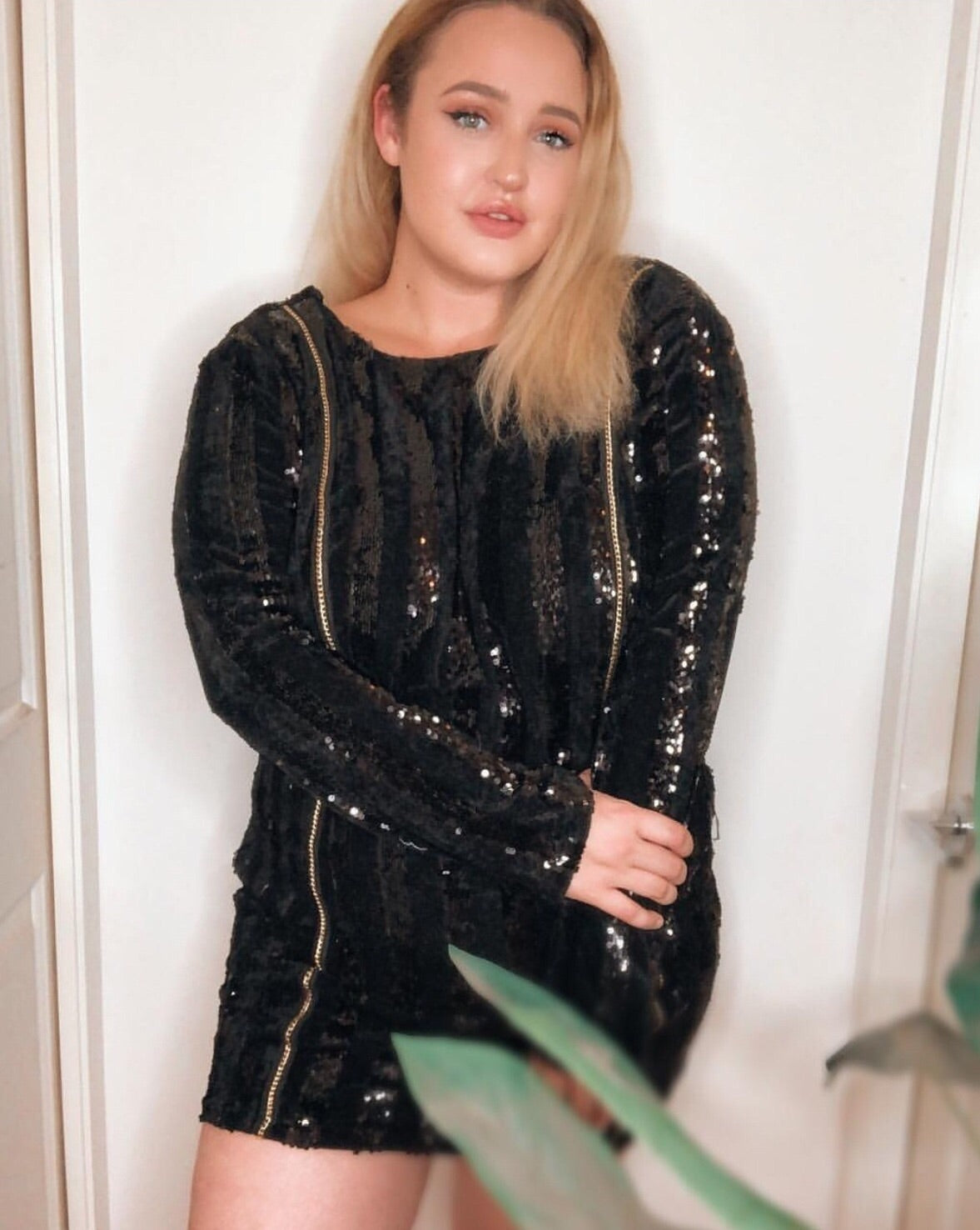 Stunning sequence glitz dress. Matching sequence belt. Zip. Above the knee
