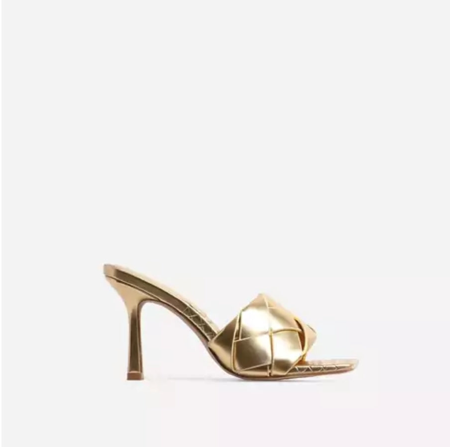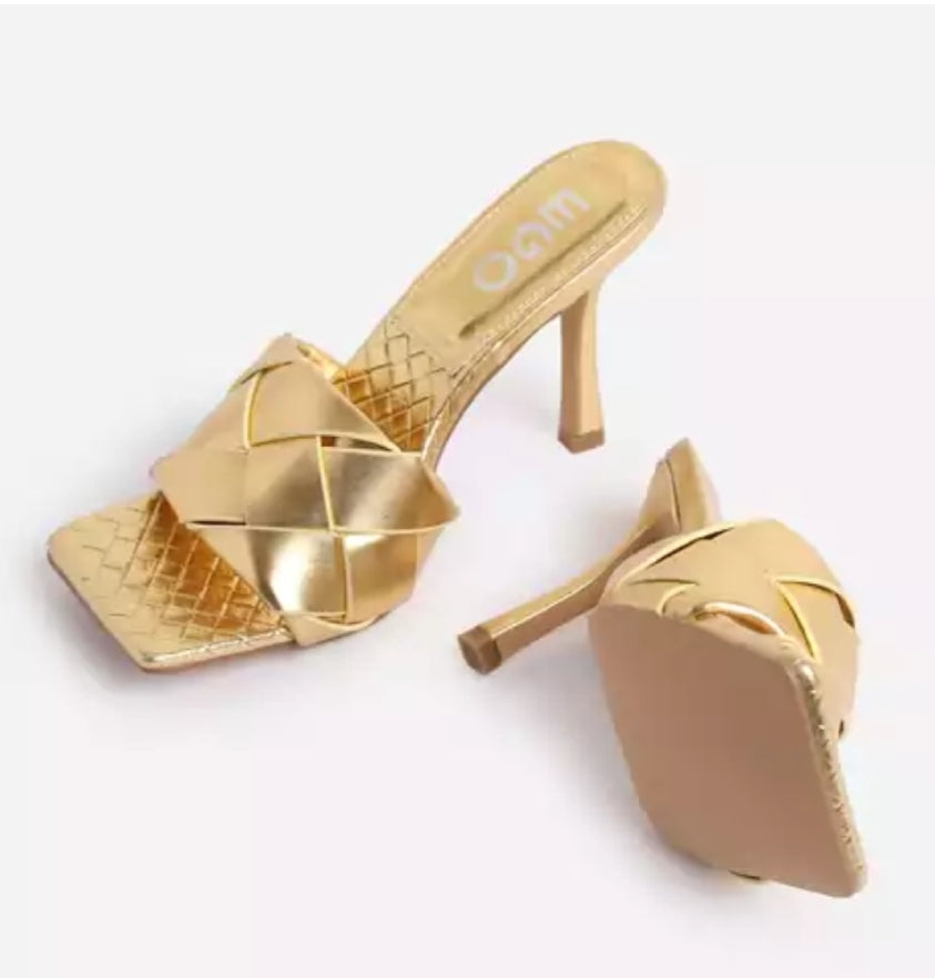 Meet the Golden Goddess heels, a unique and exquisite pair of heels that will make you stand out in a crowd. The premium, golden colour is sure to complement any outfit and the versatile design matches any occasion.These mules features low stiletto heel, square toe, woven upper and gold metallic finish a must statement piece for this season .Limited stock!