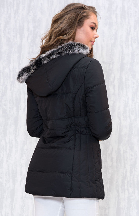 Black padded soft fur hooded coat. Zip and button up. Pockets. Fully padded.