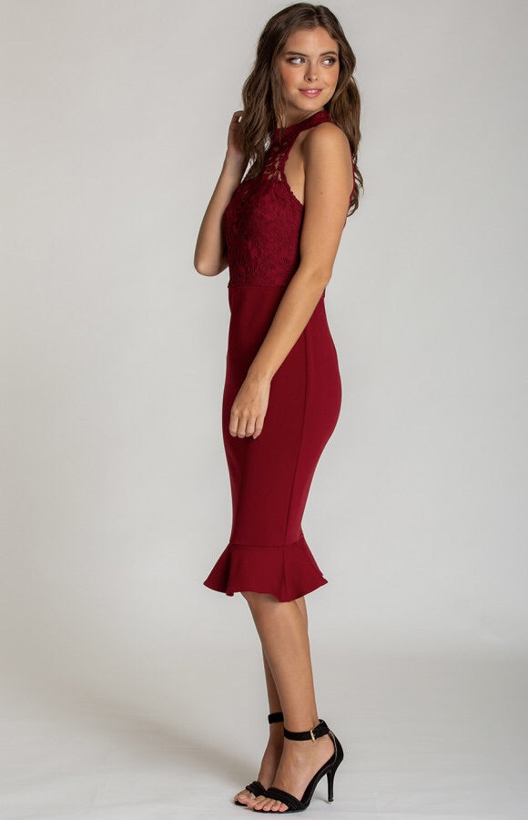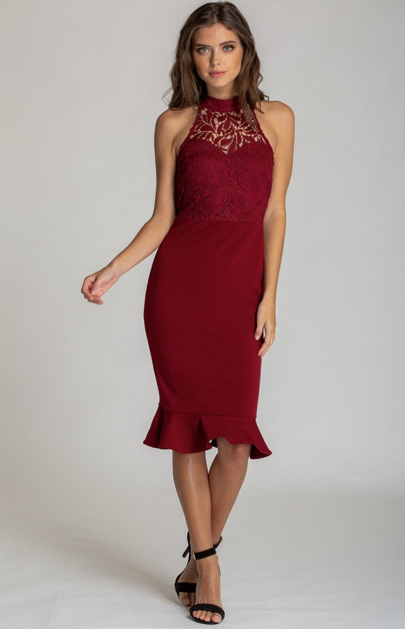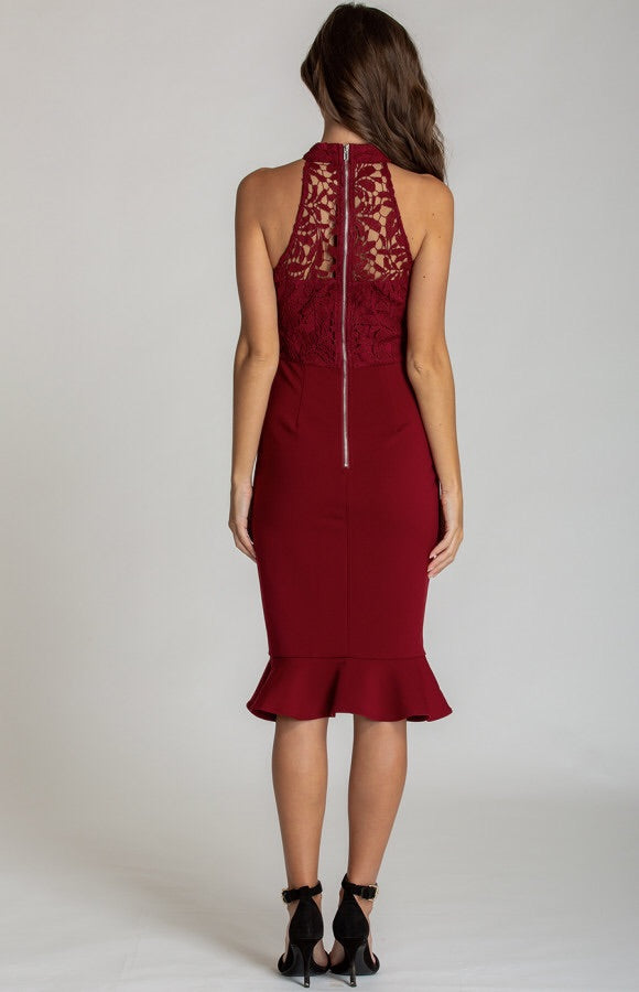This dress is a beautiful piece. With its wine in colour. Embroidery lace fabrication in the bodice. Halter neckline. Centre back metal zip. Fishtail hem . Knee Length. It’s going to stand out. Our model is 168cm tall and is wearing a size 6