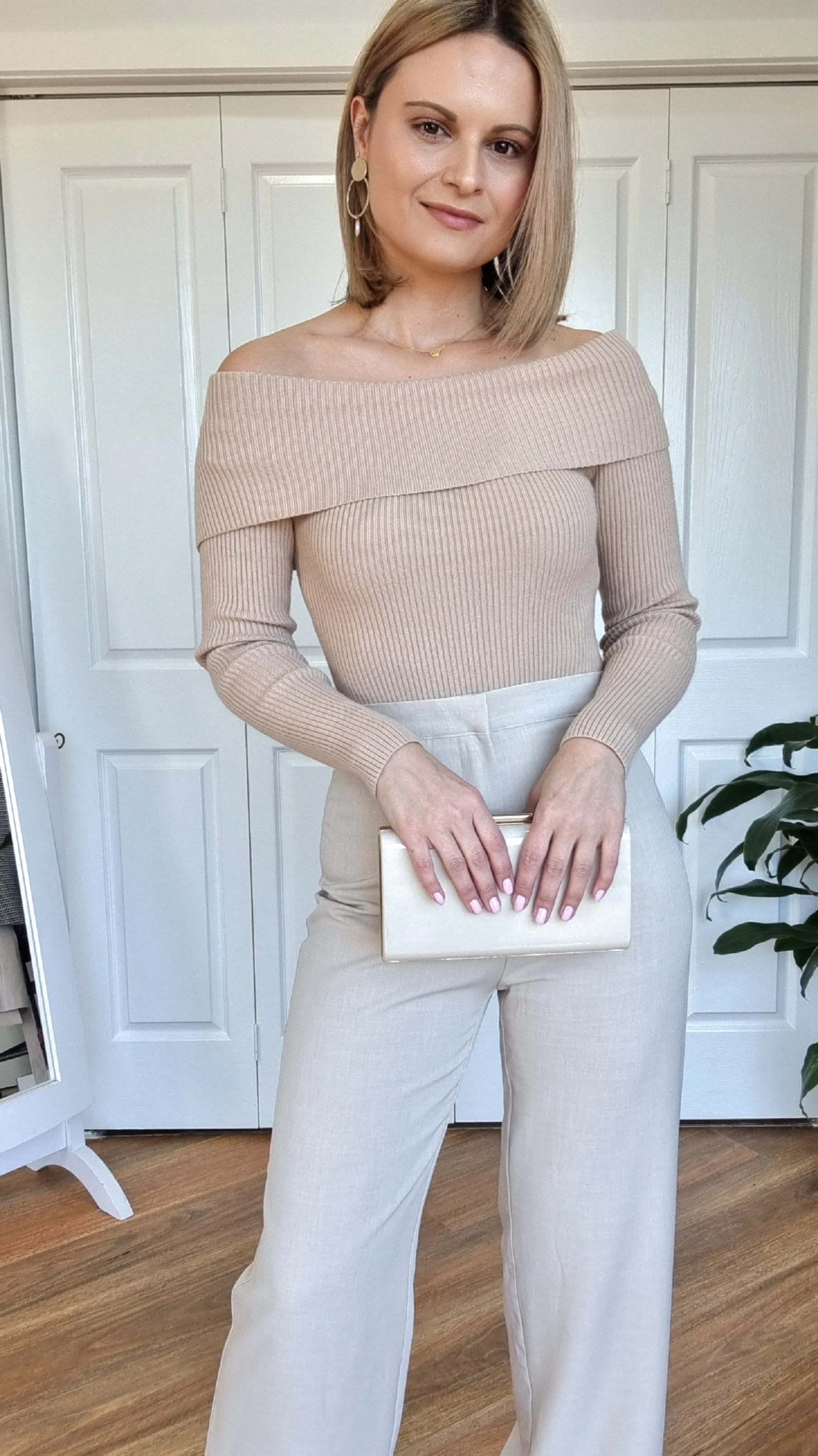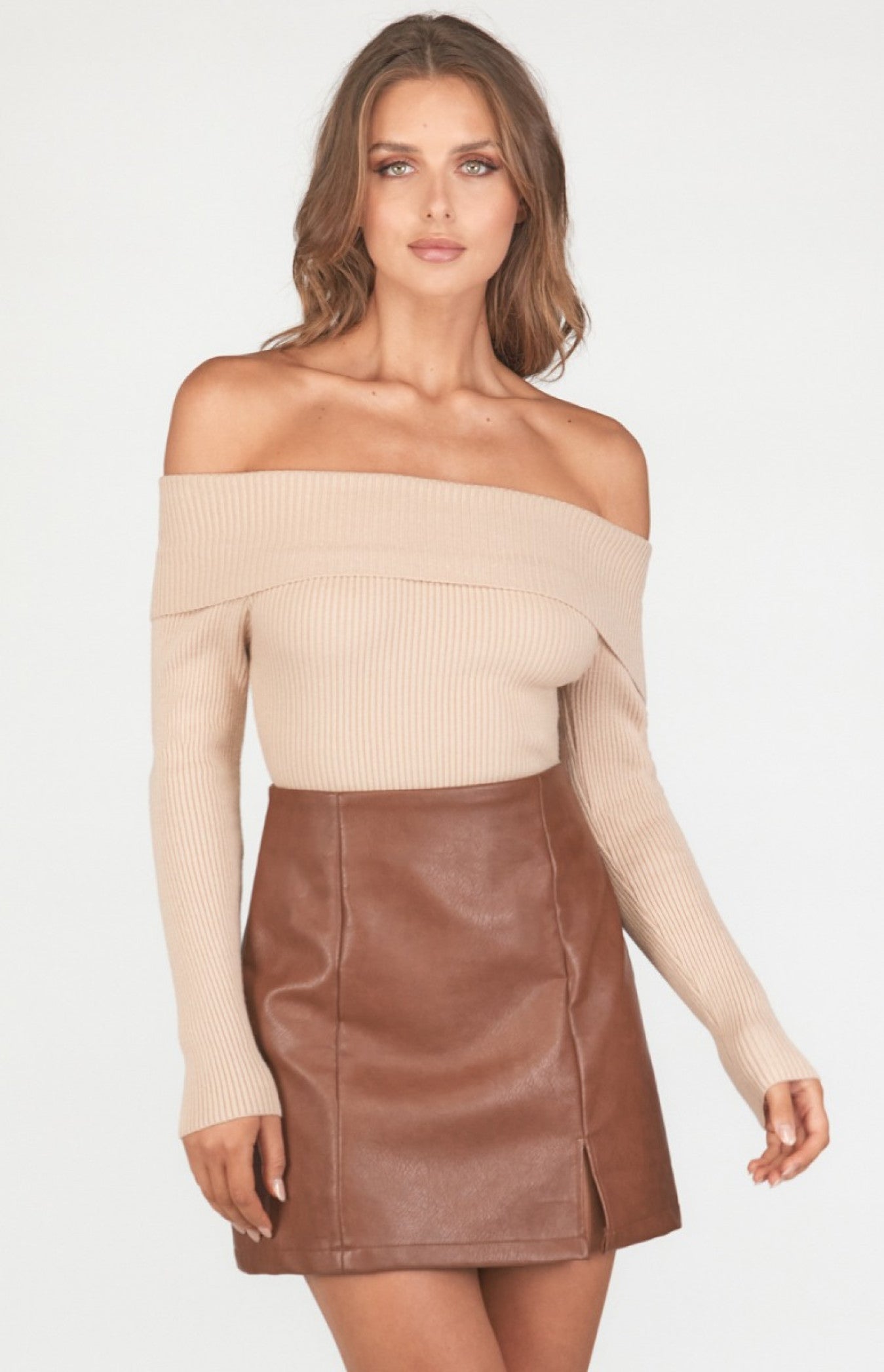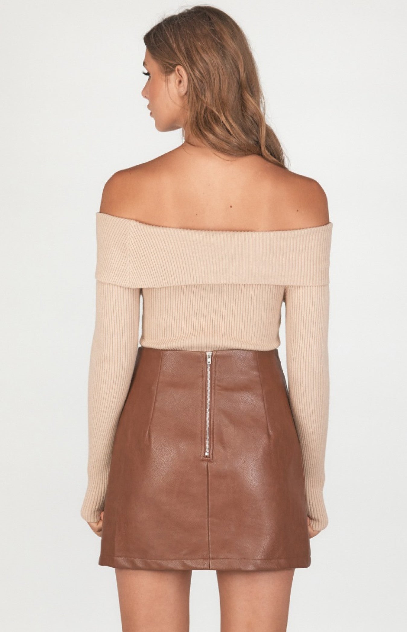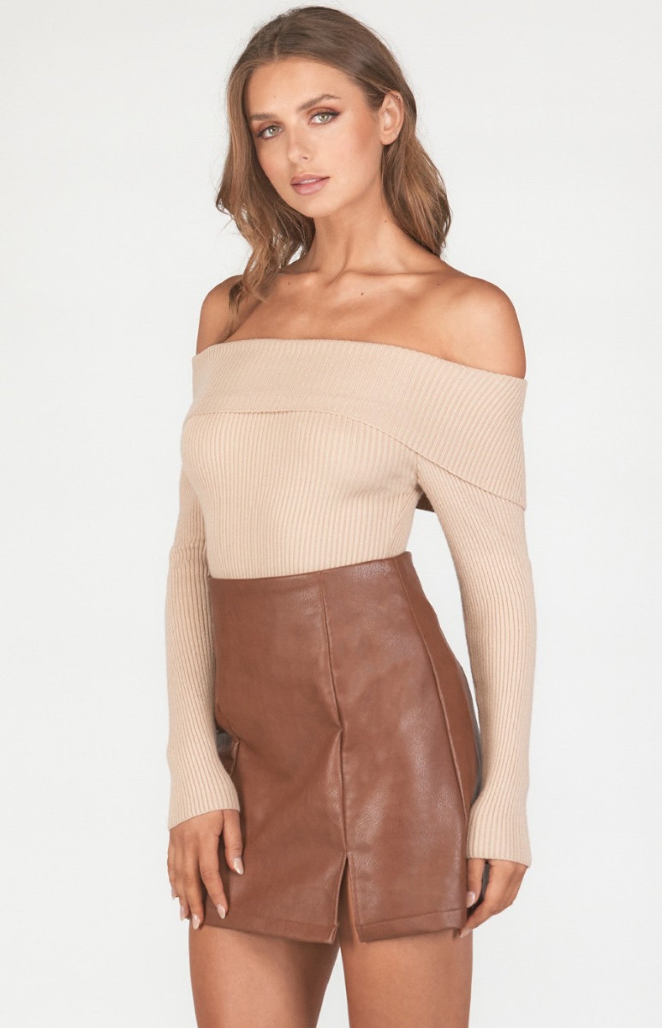 This knit body suit features Off the shoulder design.Long sleeve design.Button and clasps at crotch. Medium weight stretch knit. Fitted design