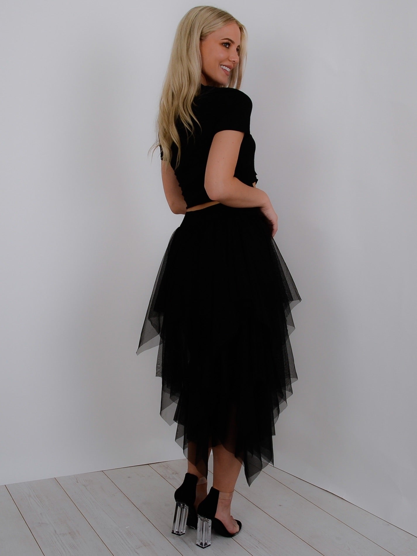 This gorgeous black mesh layered midi skirt is sure to make a statement. With its edge layered design.