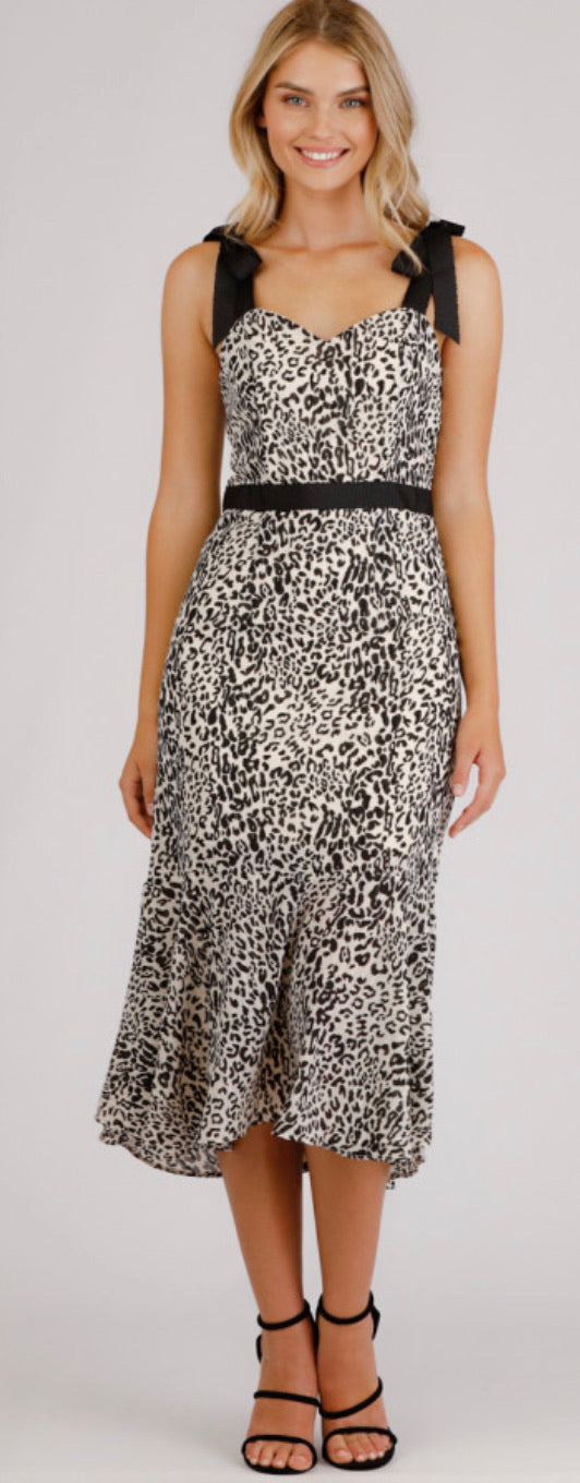 This midi dress is a must have for this season with it's Black Textured non-stretch fabric. Leopard print. Contrast trim tie up straps. Sweetheart neckline. Boning structure. Centre back invisible zip