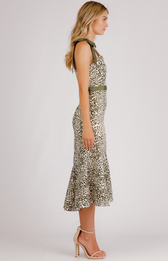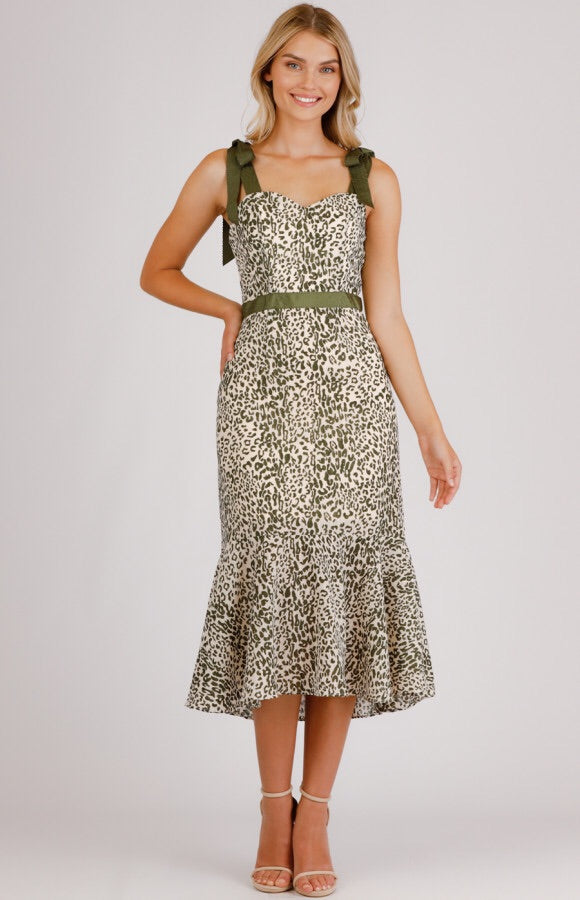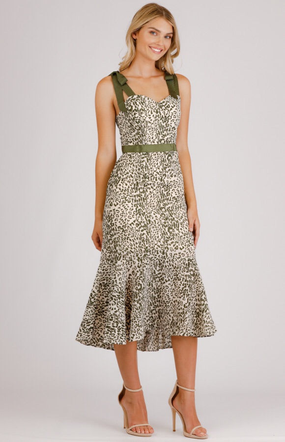 This midi dress is a must have for this season with it's Kahki Textured non-stretch fabric.  Leopard print.  Contrast trim tie up straps. Sweetheart neckline.  Boning structure. Centre back invisible zip