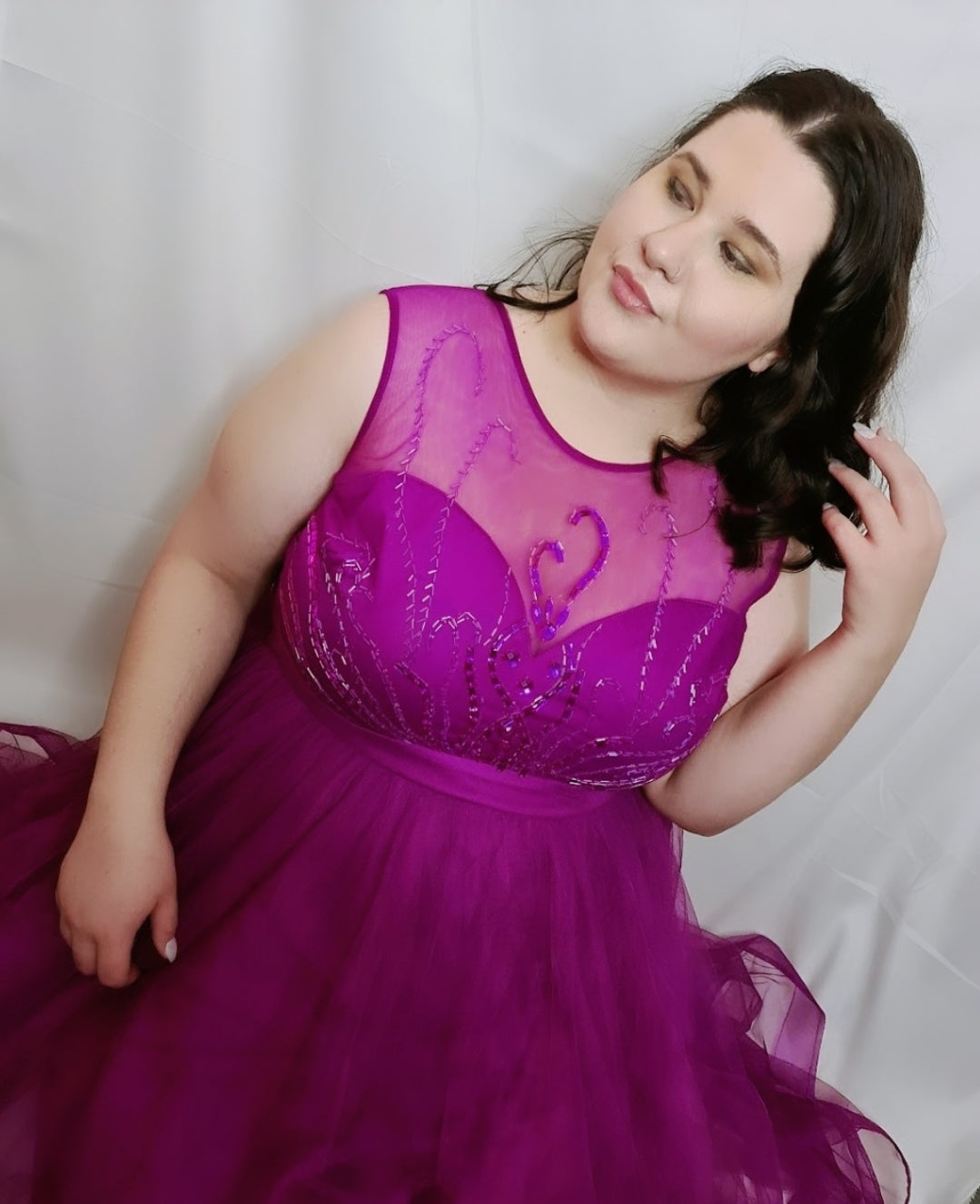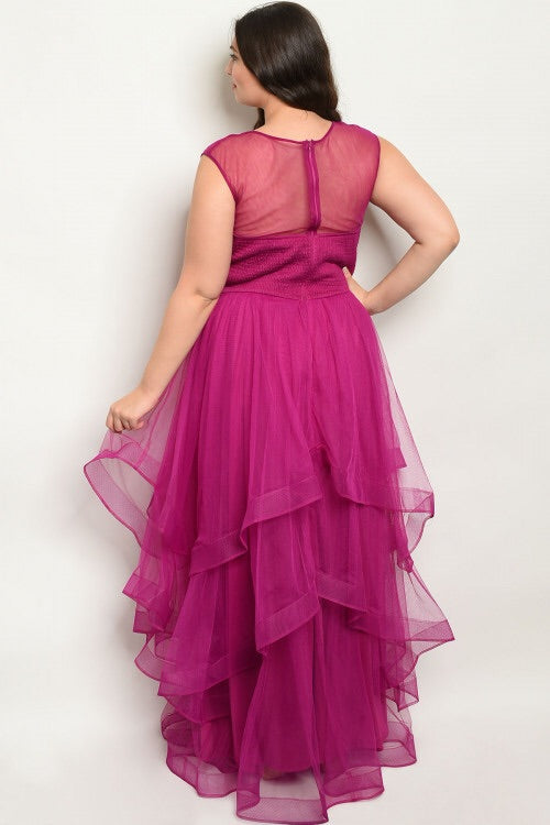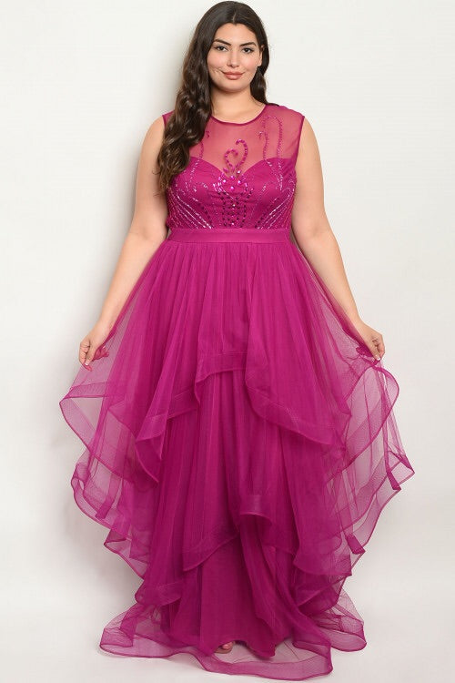 This gown is exclusive to the Plus / Curvy range. It’s layered with tile. Magenta in colour. Sheer and beaded bodice and zip back. Absolutely stunning dress