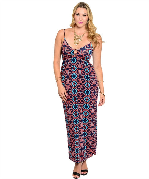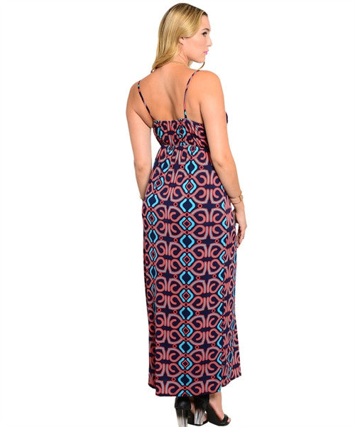 Plus size spaghetti strap maxi dress features a bold geo style pattern design with V-neckline. Very flattering