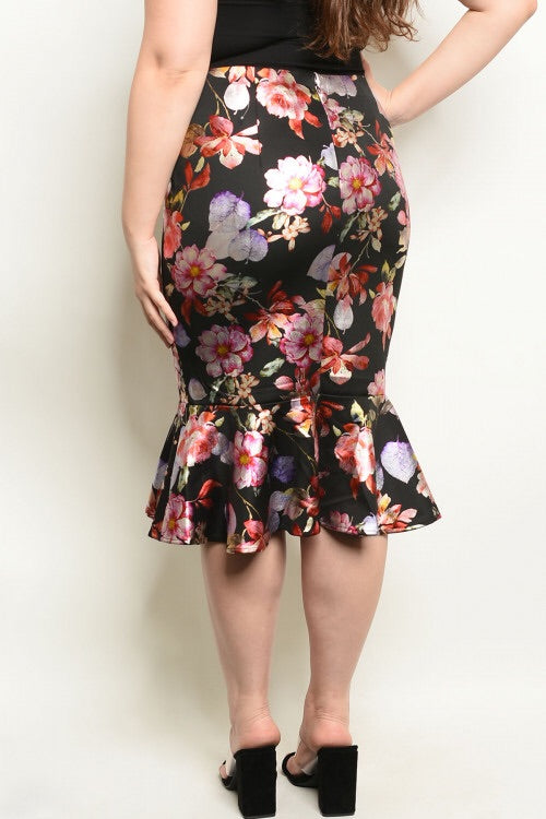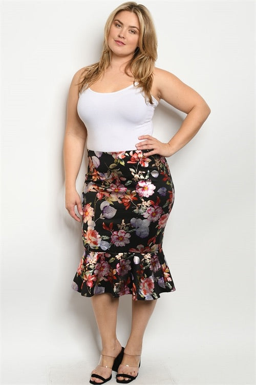 This gorgeous skirt is exclusive to the curvy plus range. Metallic floral design high waisted tulip design. Team up with a wrap around top or singlet.