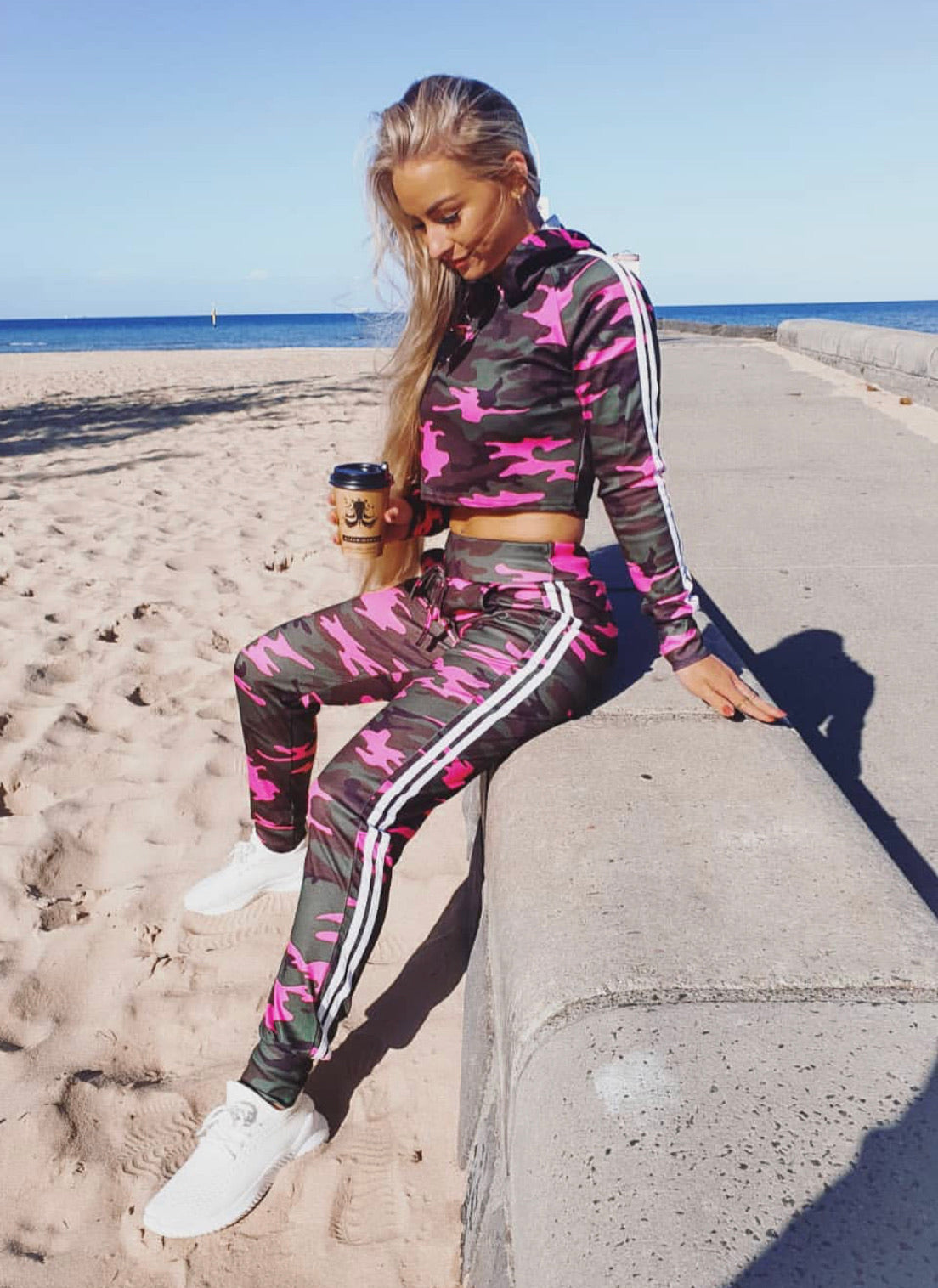 Neon camp track set. Crop hoodie. Fitted Track pants with drawstring. White stripe. Camo design with neon green. High waisted. Turn heads in this statement set.