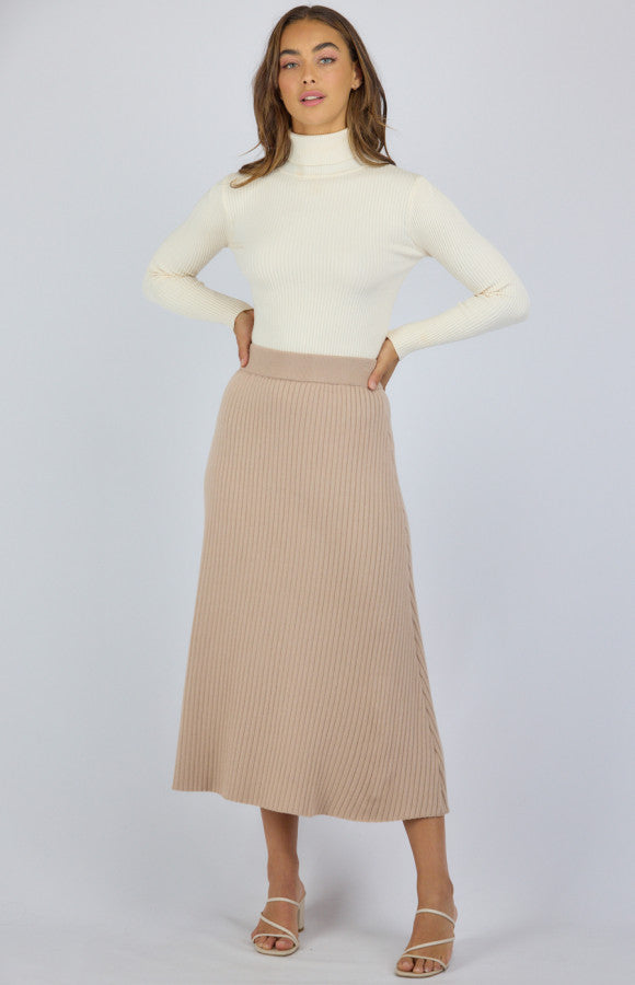 This skirt is perfect to go from day to night with its Ribbed knit design. Elastic waistband .A-line silhouette design. Midi length. Fitted at the waist. Model is 173cm tall and is wearing a size 6