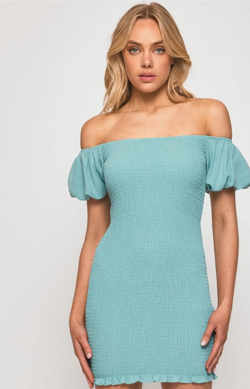 This dress is stunning with its beautiful colour off the shoulder detail. Can also be worn on shoulder. Stretch gathered bodice detail. Above knee