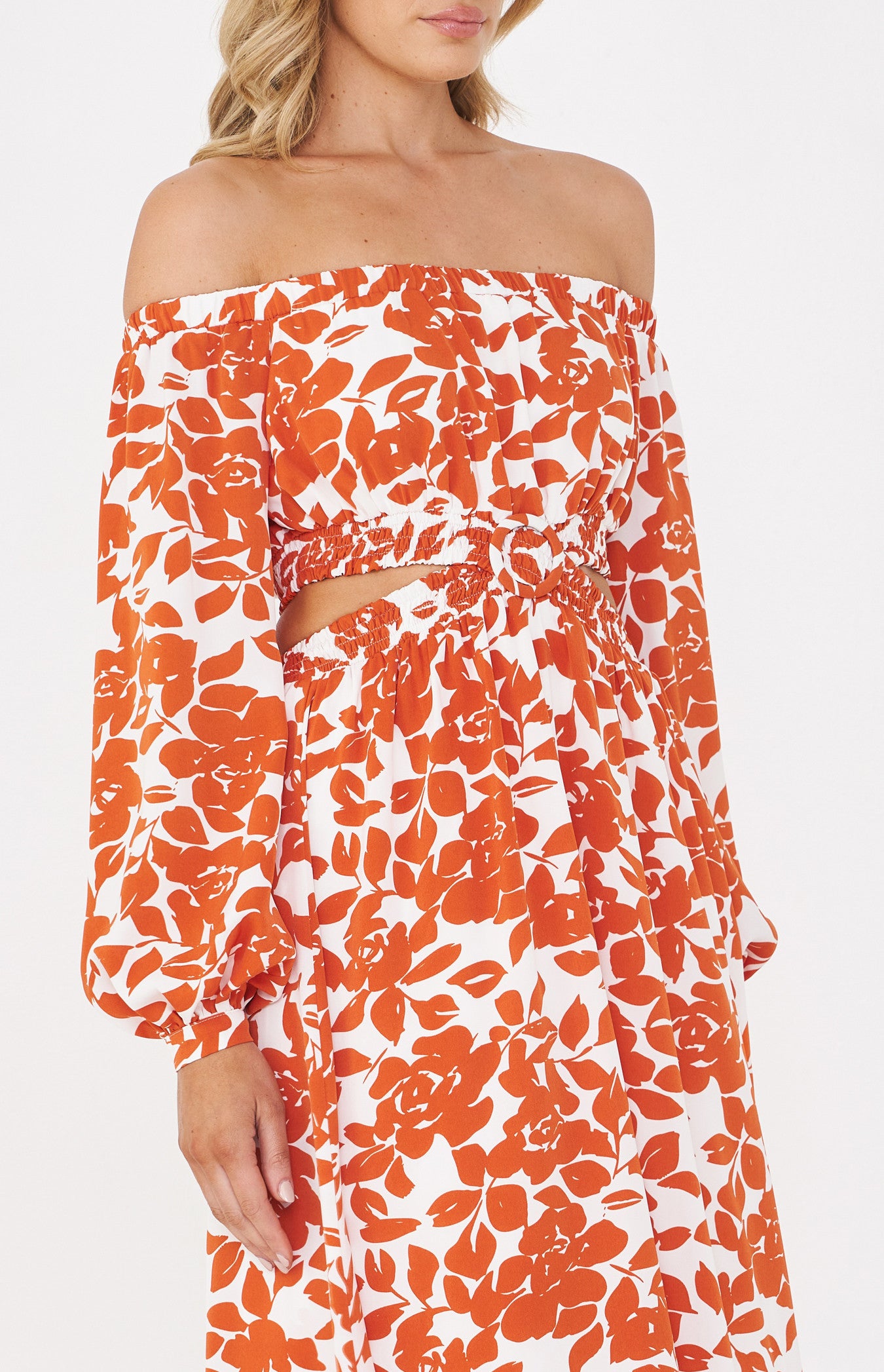 This dress is elegance with its Printed fabricationOff the shoulder design.Long sleeves design with button cuffs.Elastic cut out with circle buckle detail.Fully lined.Maxi length