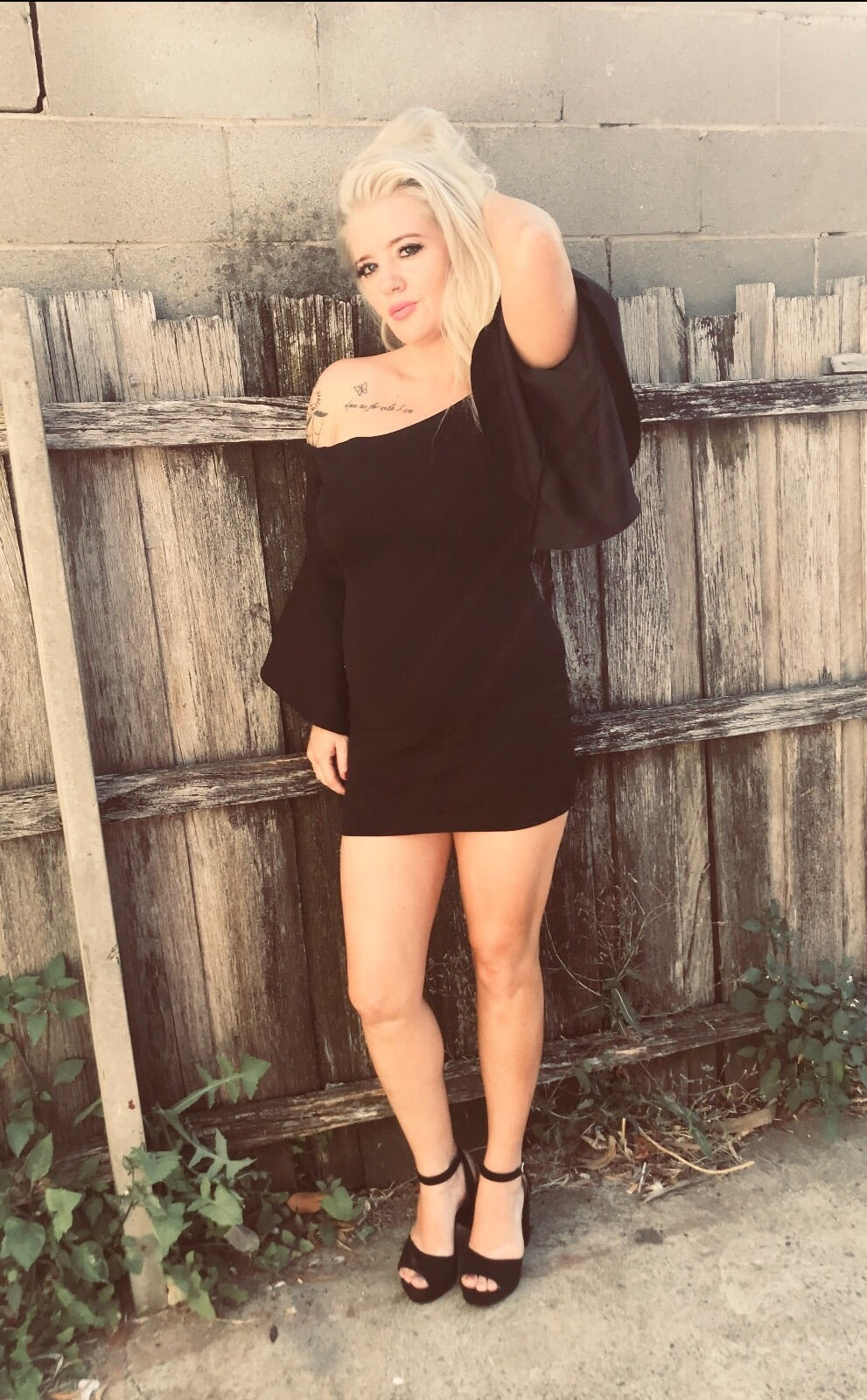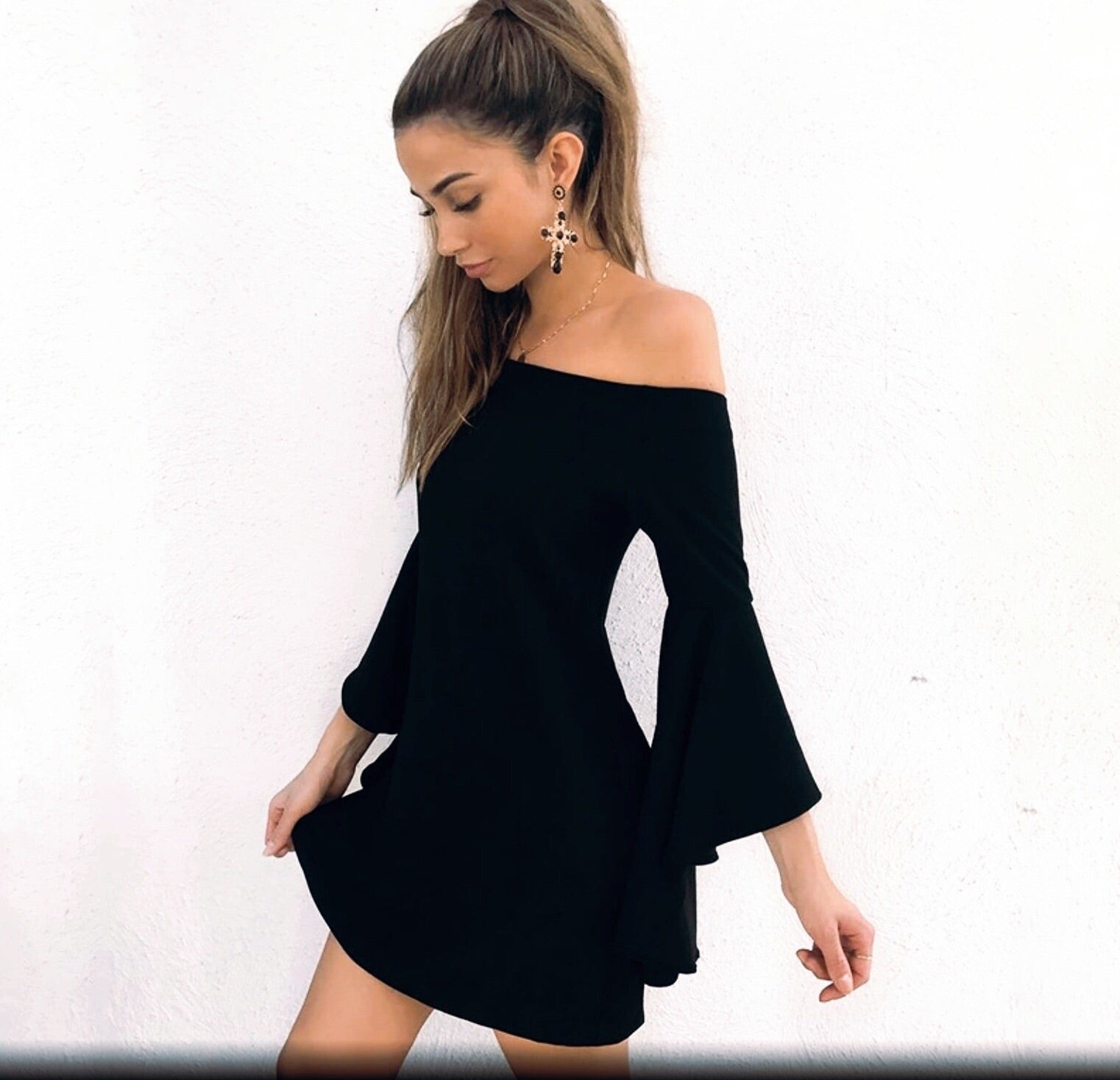Black dress off the shoulder. Stretch. Bell sleeve. Knee length