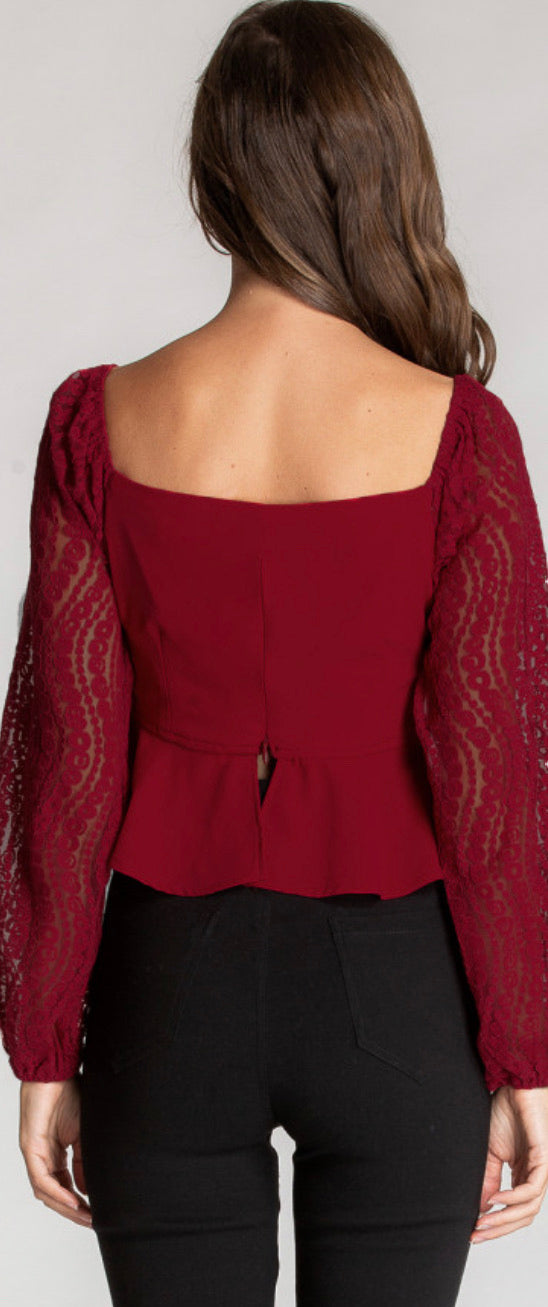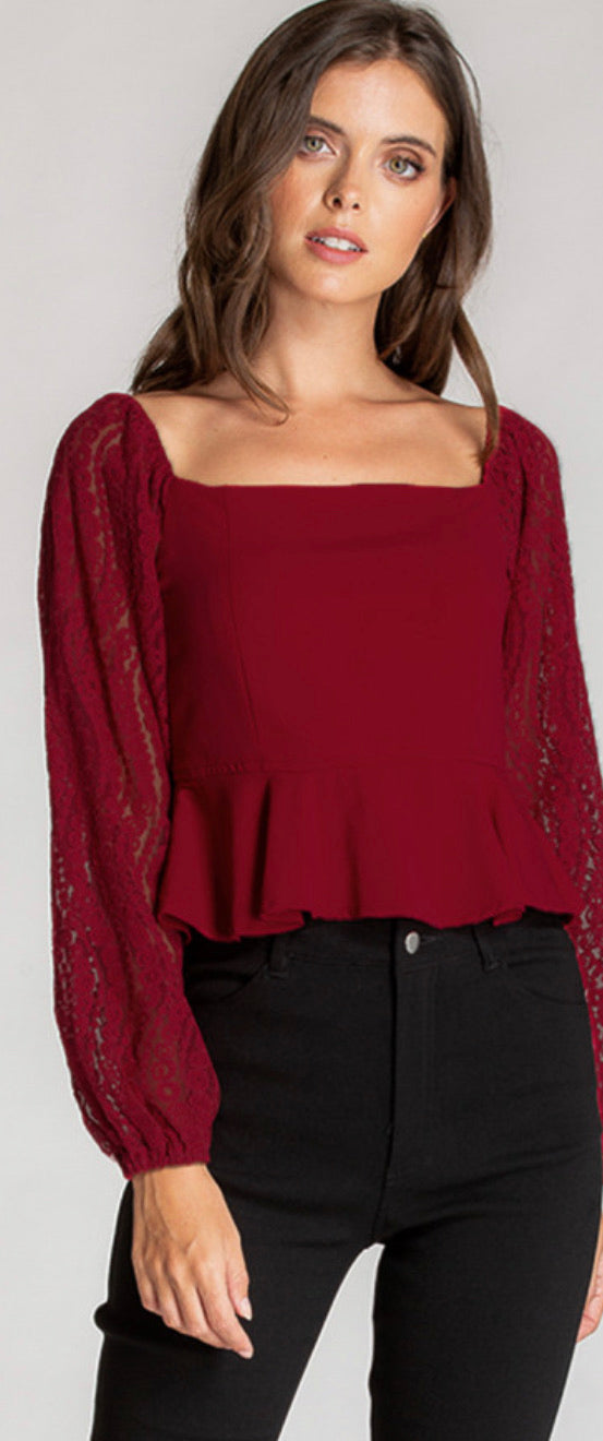 This top can be worn on and off the shoulders. It has lace detail down the arm. Wine red in colour. A beautiful piece for your wardrobe