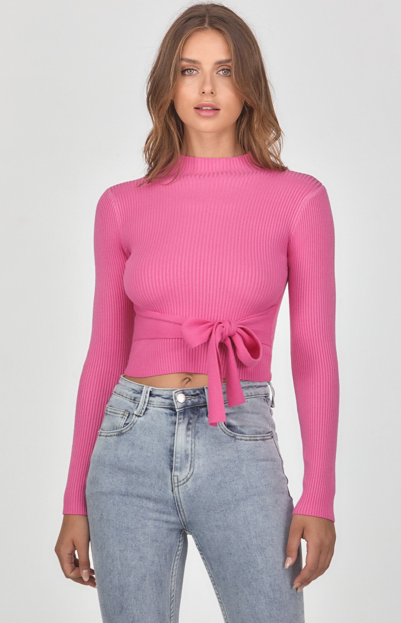 This high neck pink ribbed top. Is a versatile piece for any wardrobe. With its Mock turtleneck design. Medium weight ribbed knit.Tie belt feature at front long sleeve design. Cropped length. Fitted design