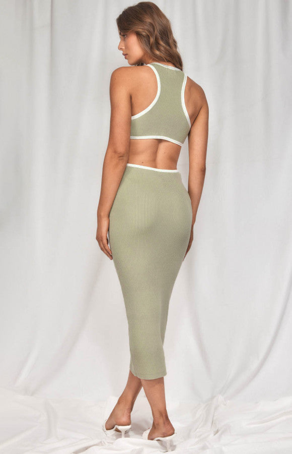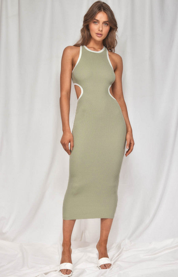This dress is beautiful with its High round necklineMedium weight knit.Contrast binding at neckline, shoulders & cut outs.Waist & back cut out feature.Midi length.Fitted. wear with heels or flats . Model is 177cm tall and is wearing a S/M