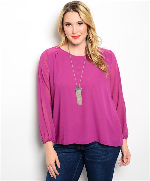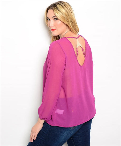 Magenta blouse in plus size. 100%polyester. Back gold detail.