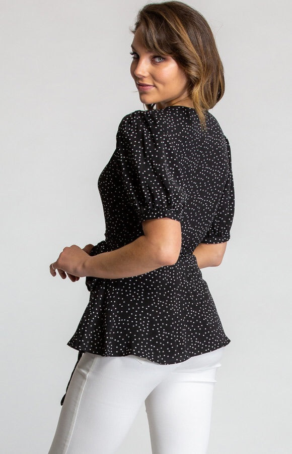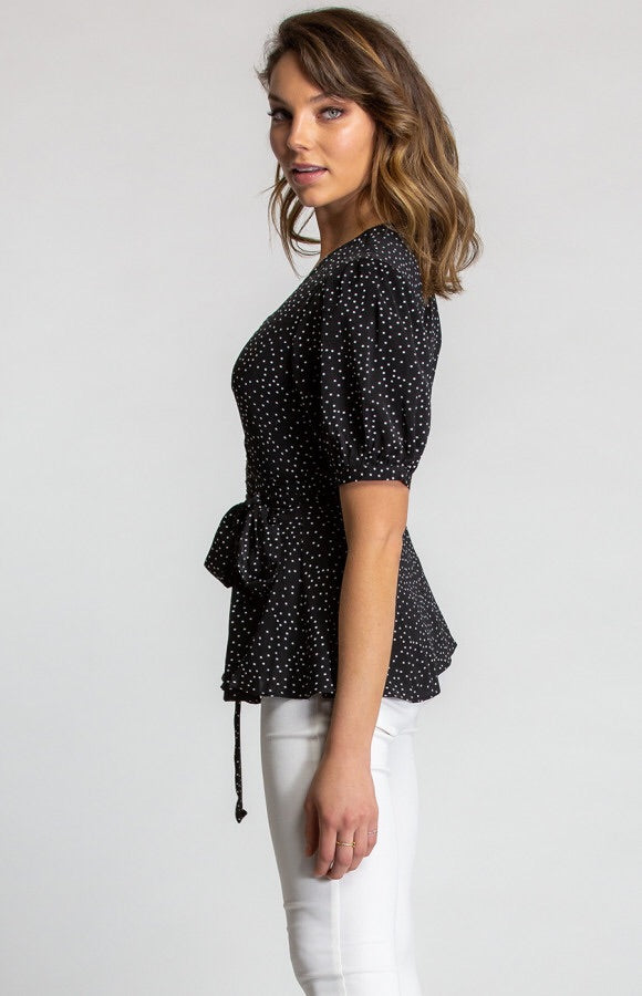 Wrap blouse design.Self fabric belt on front.Polka dot fabric. Great for evening and office.