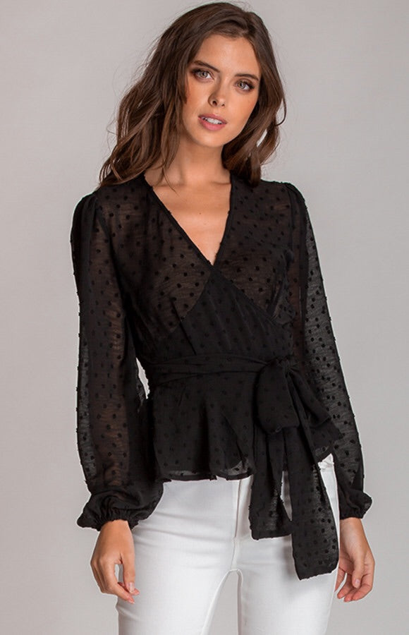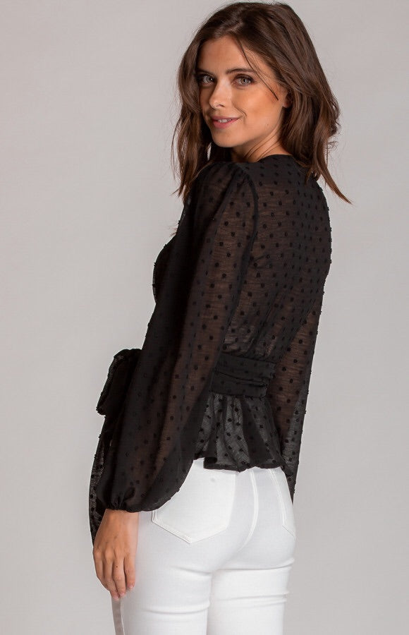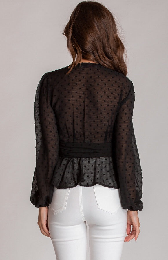 Black sheer polka dot blouse. Tie up. Ruffel detail along hemline . Wrap around detail