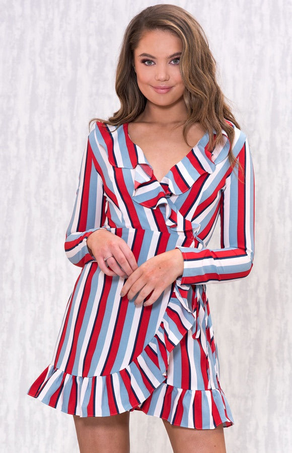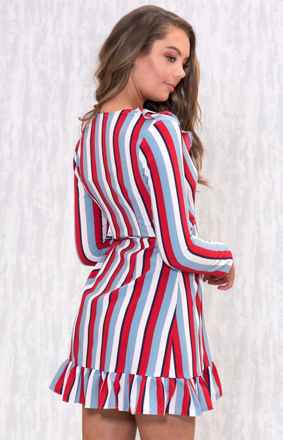 Gorgeous bold striped red, blue and white ruffle dress. Above knee. Shaped waist.