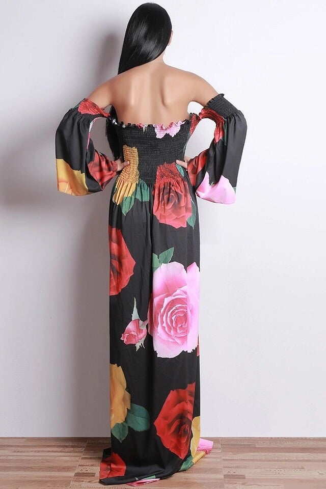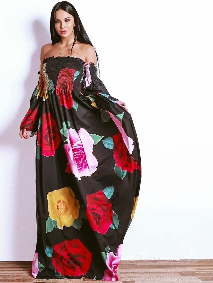 Off the shoulder maxi dress with flower design all over it. Elastic at arm and bust. Long stunning statement