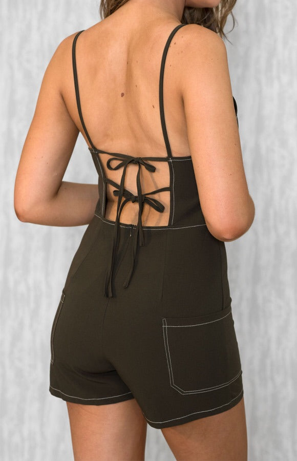 Gorgeous elegant khaki safari playsuit. Open tie up back. Short.zip back.