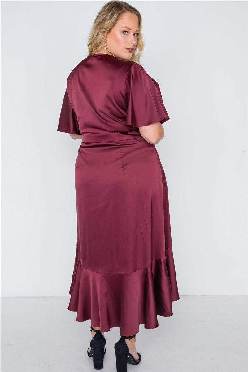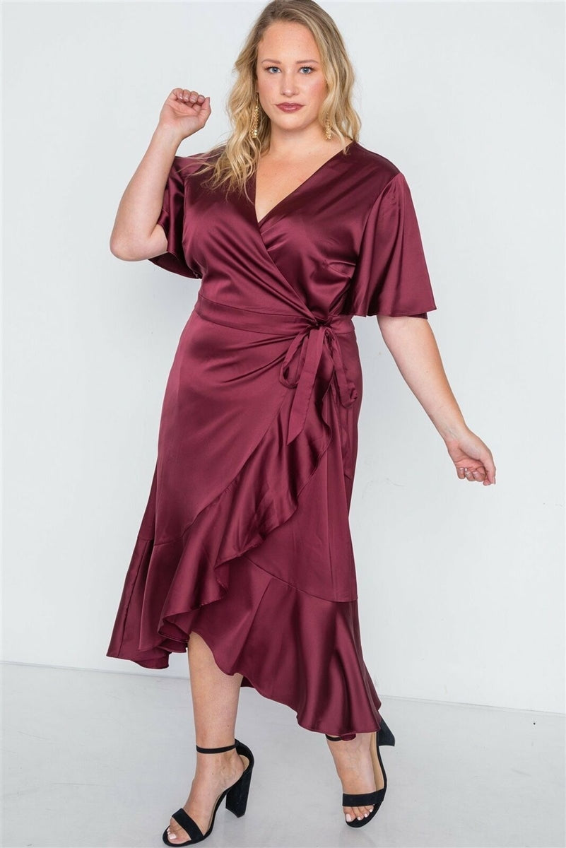This dress is so divine and exclusive to our curvy plus range with its short flounce sleeves, surplice neckline, self tie side closure, flounce hem, unlined