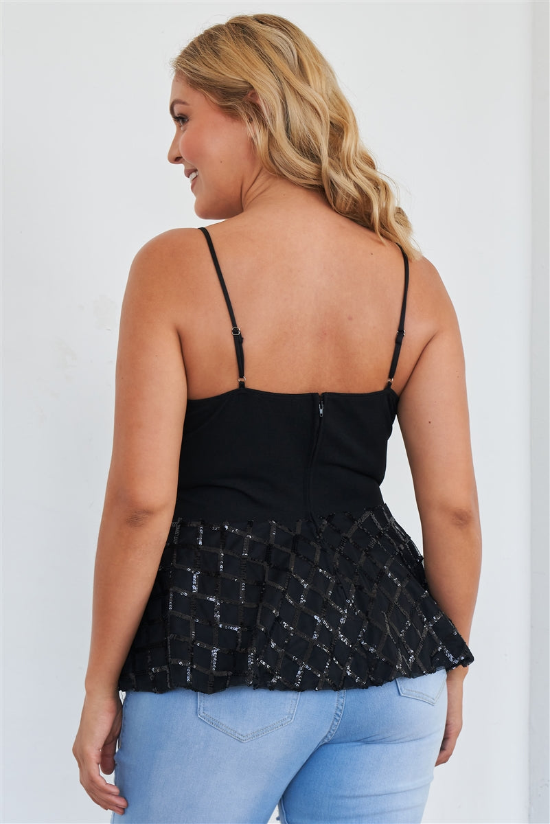 This top is stunning and exclusive to the curvy plus range with its black all over sequin, sleeveless, adjustable cami straps, v-neck, peplum, lined, some stretch. Great for date night, clubwear, fun, festive