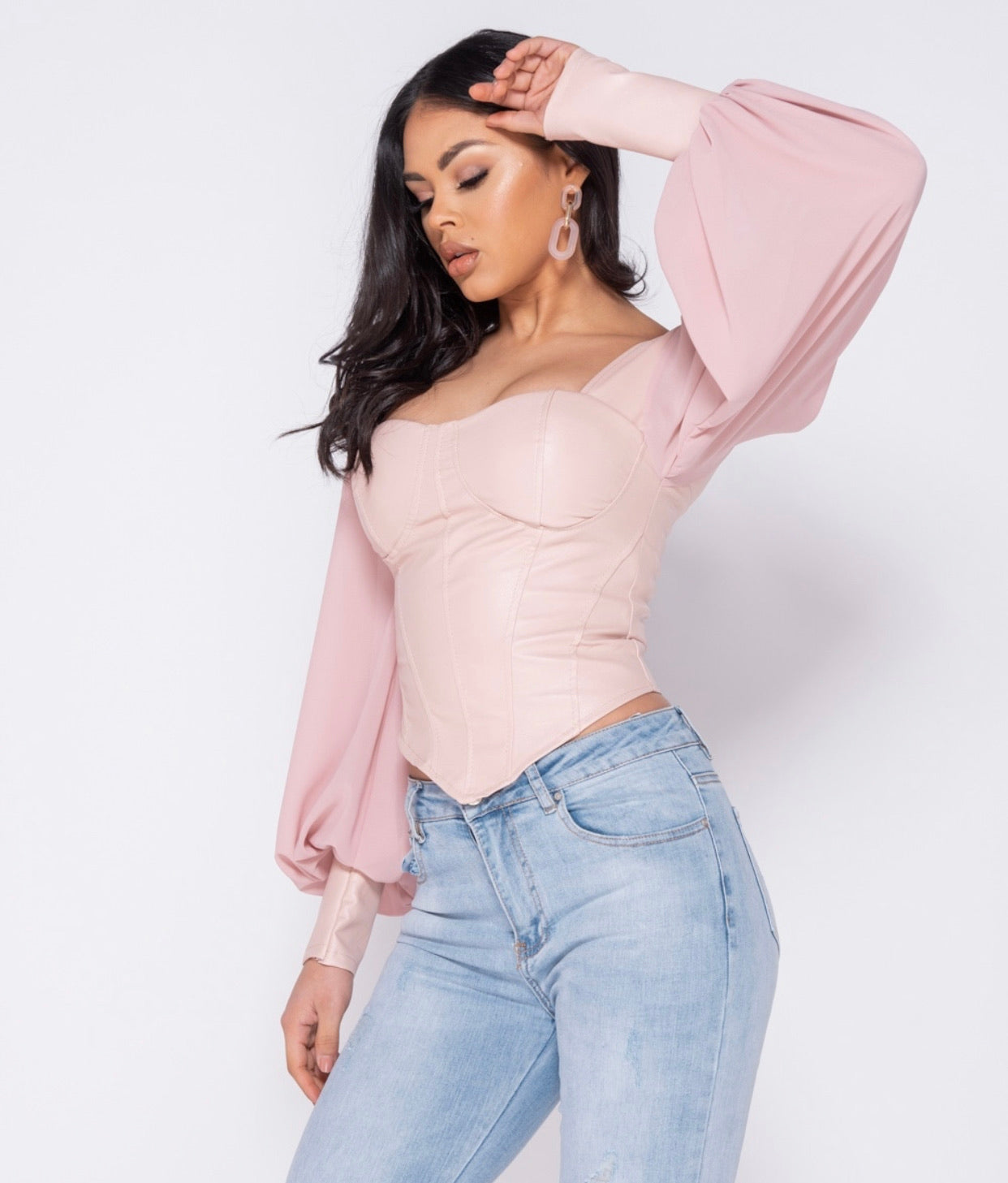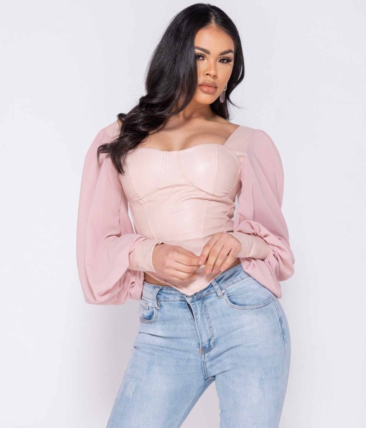 This corset is fitted detail & sheer sleeves can be styled with skinny jeans & strappy heels for a hot evening look! pu leather look top. corset detail. sheer sleeves. regular fit. approx length is 51cm based on a UK size 10model is 5ft 7" & wears UK size 8/EU size 38/US size 4/AUS size 8