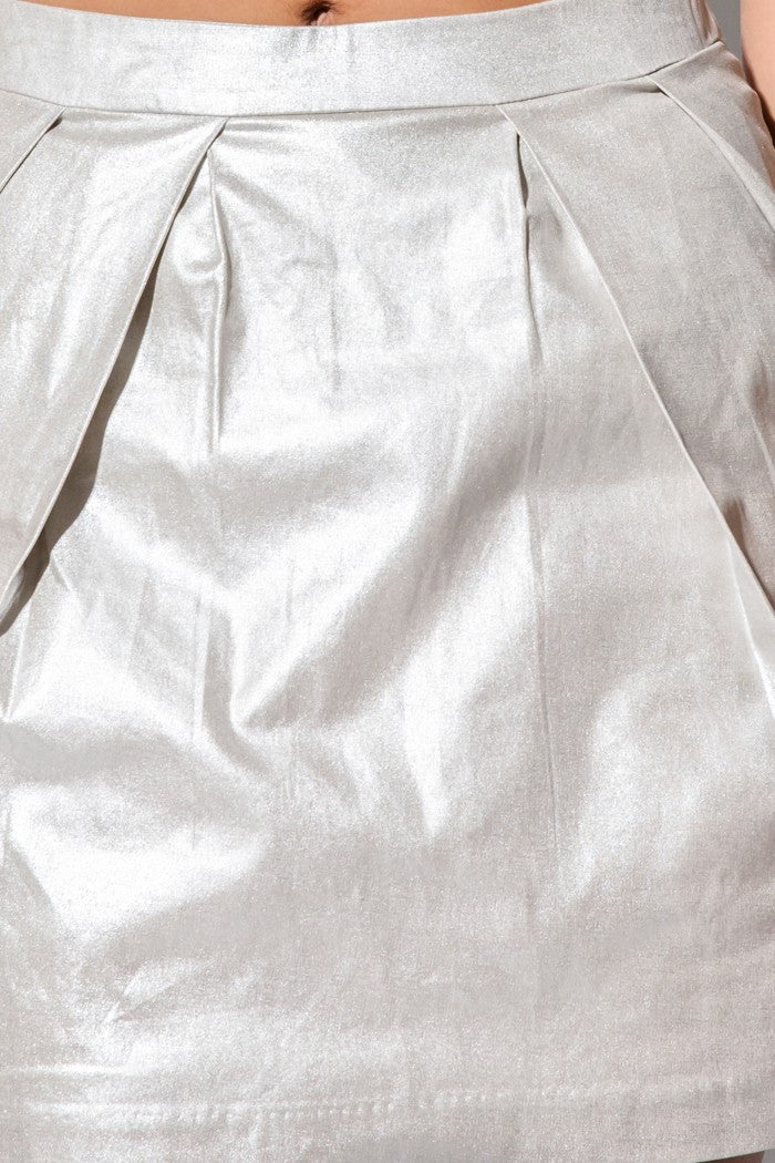 Silver pearl metallic party mini skirt. Zips up pleated front.USA
