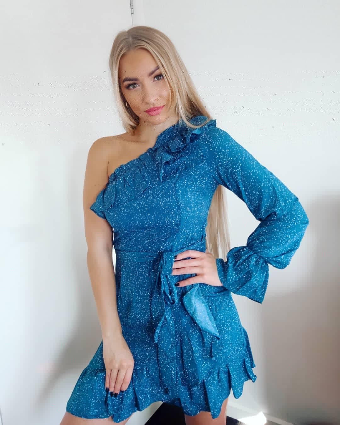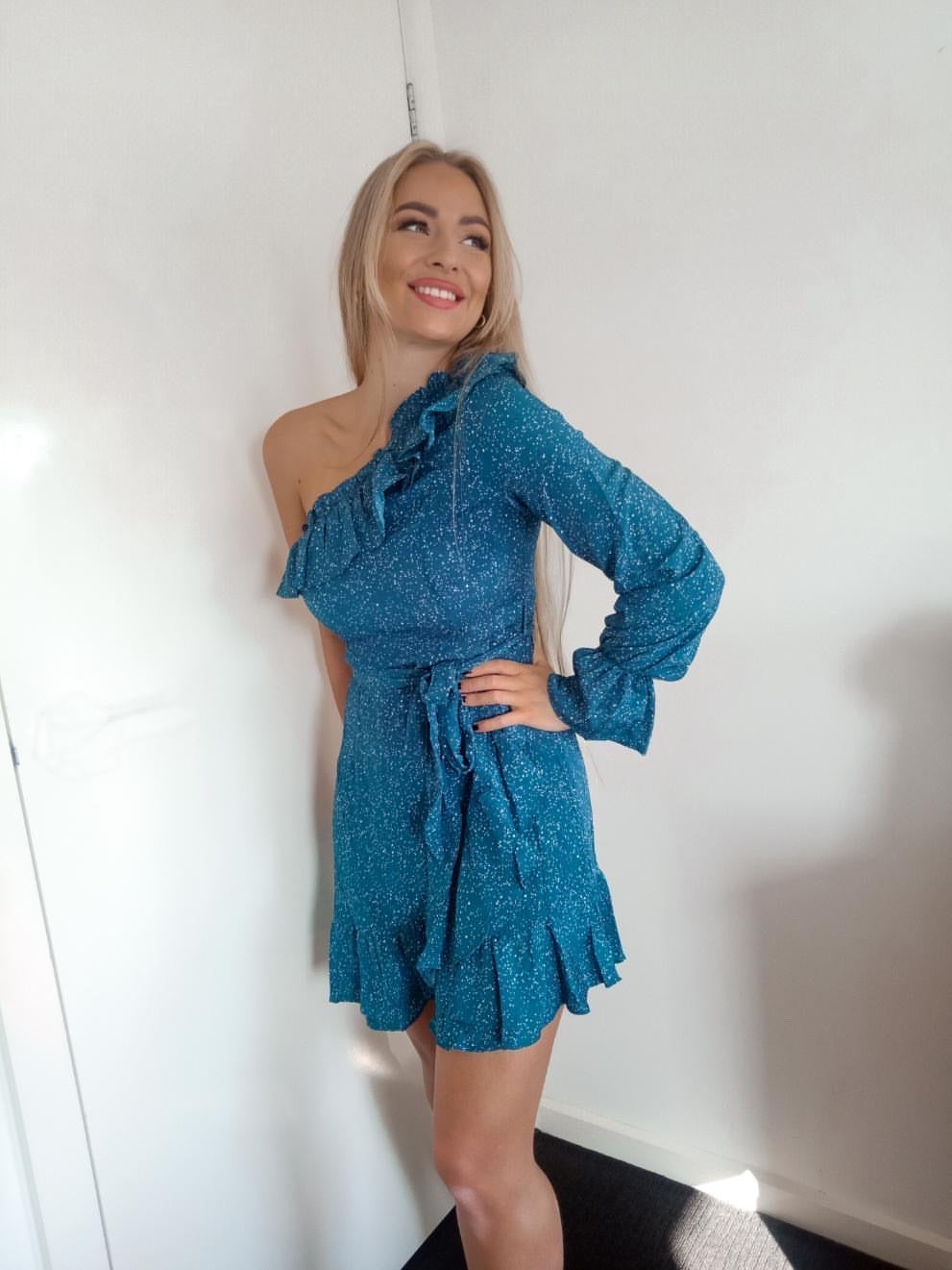 This dress is so Devine. With its delicate soft fabric. One shoulder design. Zip up. Tie waist and mini style it’s a great dress fit many occasions