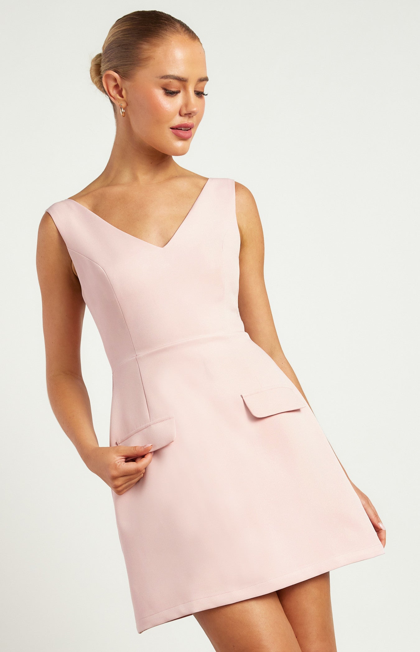 Get ready to turn heads in our Structured Mini Dress! Made from a dressy poly blend, this dress features a flattering V neckline and bodice seam detail for a perfect fit. The faux pocket with pocket flap adds a touch of chicness, while the A-line skirt design creates a structured silhouette. With a centre back invisible zip and fully lined interior, this dress is both stylish and convenient. Perfect for a night out, this mini dress is fitted at the bodice and falls above the knee. (Material: Main- 95% Polyester, 5% Spandex, Lining- 100% Polyester)