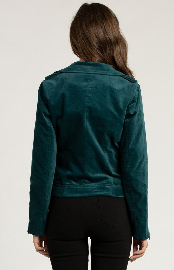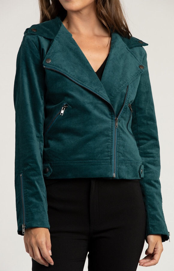 Gorgeous emerald biker jacket. Suede. Zip up & zip cuffs Pockets. Perfect to wear with a dress or add to jeans